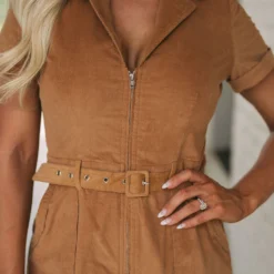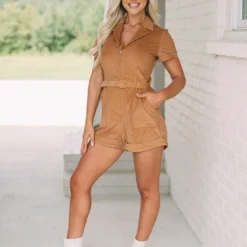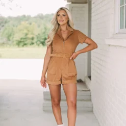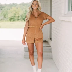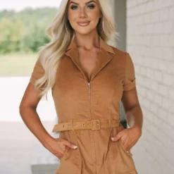 The Addison Suede Romper- Camel is an essential for your wardrobe needs. Crafted with a luxe suede finish, allover camel hue, and classic details like a collared neckline, zip up front, and cuffed hem, this romper is perfect for any occasion. Plus, it features pocket accents and a detachable belt for an extra hint of style.