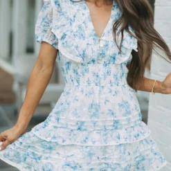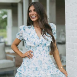 Make a statement with the Addy Floral Dress-Blue! This beautiful blue and white dress features intricate white crochet trim, a v-neckline with button accents, smocked waistline, and a ruffled tiered skirt for a charming look. Get ready to shine in style!