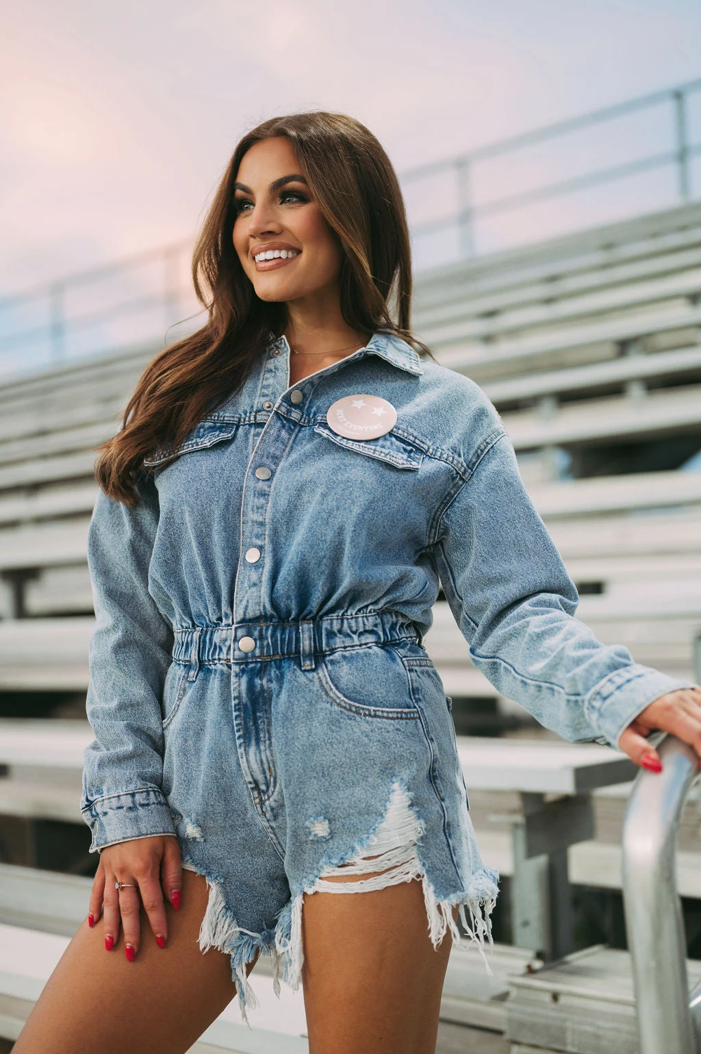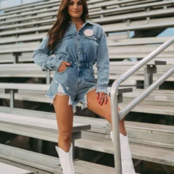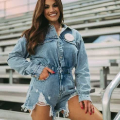 Make a statement in this Adley Distressed Denim Romper – the perfect combination of style and comfort. Enjoy the distressed detailing, button snap and zipper closure front, and pockets – all designed with you in mind. Show off your unique sense of style with this fun romper!