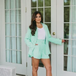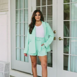 The Aly Blazer is the perfect addition to any wardrobe. It features a classic, green blazer look with added touches like padded shoulders and pocket accents for a stylish and professional look!
