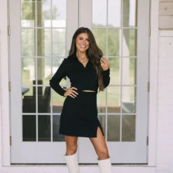 Experience classic style with a modern twist in this Annie Knit Skirt Set-Black! The black sweater knit set, with its long sleeve sweater and collared neckline, is perfect for any occasion. This set also includes a high-waisted skirt with a stylish side slit for an extra touch of fashion. Meet your new favorite set and look fabulous today!