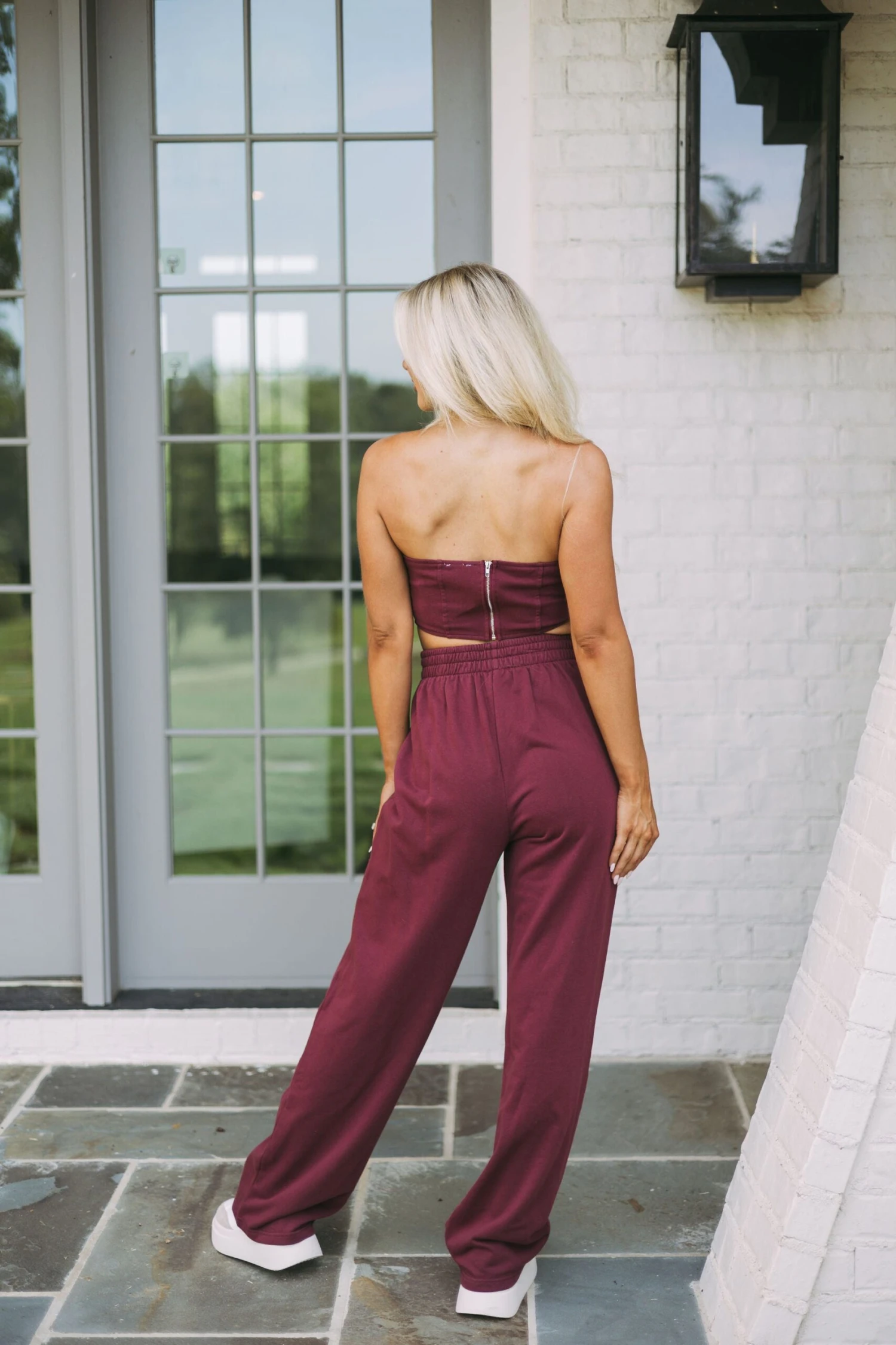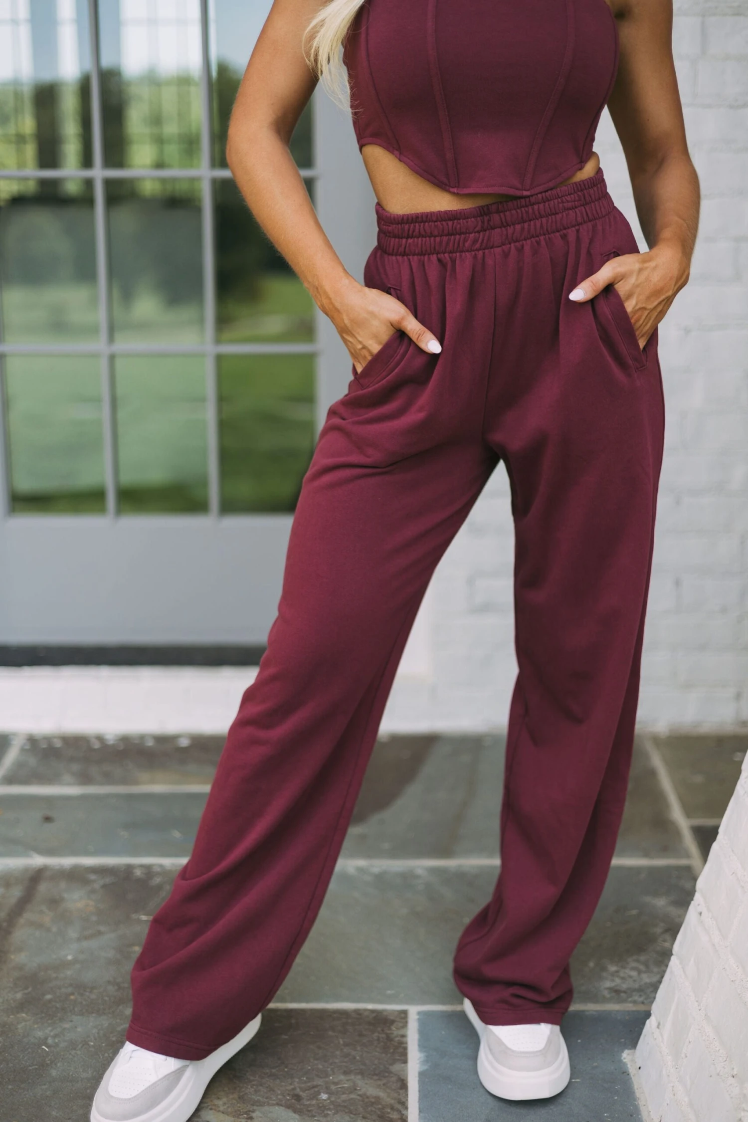 - The Asher Wide Leg Sweatpants are designed with comfort and style in mind. Crafted with a burgundy hue, these sweatpants feature a high-waisted fit and a stretchy waistband for a secure fit. The wide leg bottom provides all-day comfort and a flattering silhouette.