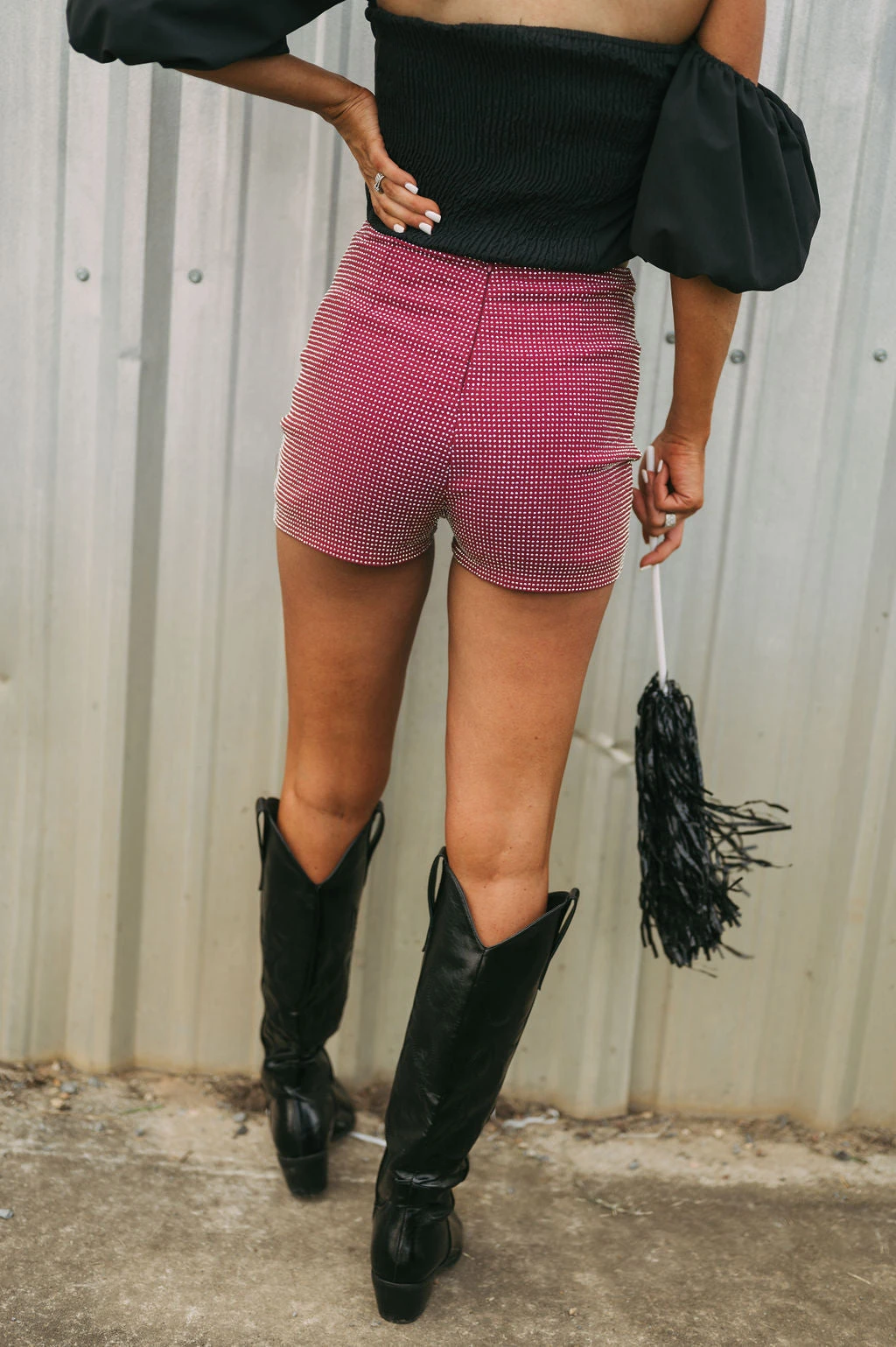- These Audrey Rhinestone Studded Shorts are perfect for giving your ensemble a bold and stylish statement. Crafted from burgundy, high-waisted material, they feature a back zipper closure with a rhinestone studded bodice to give an extra sparkle.