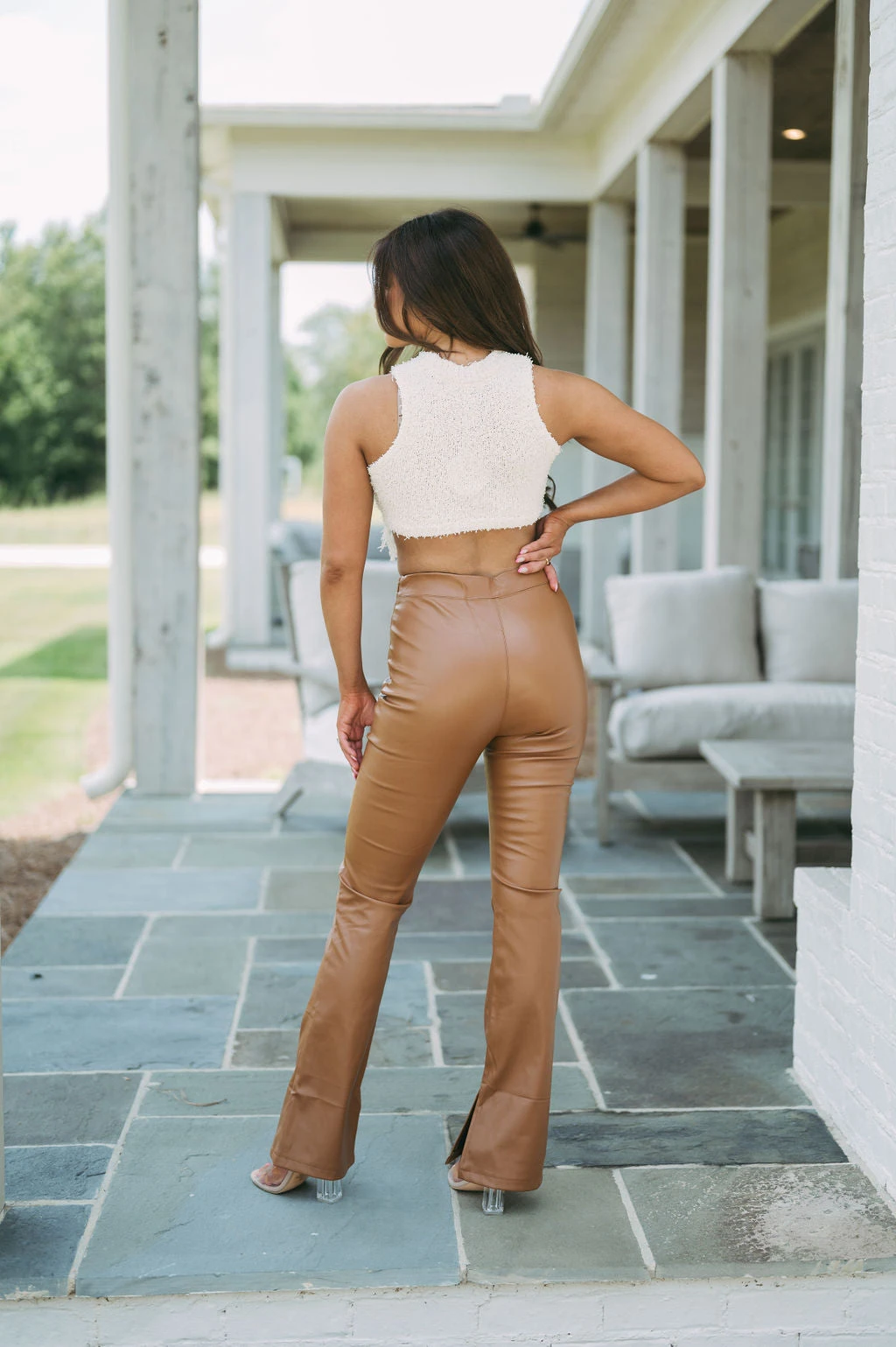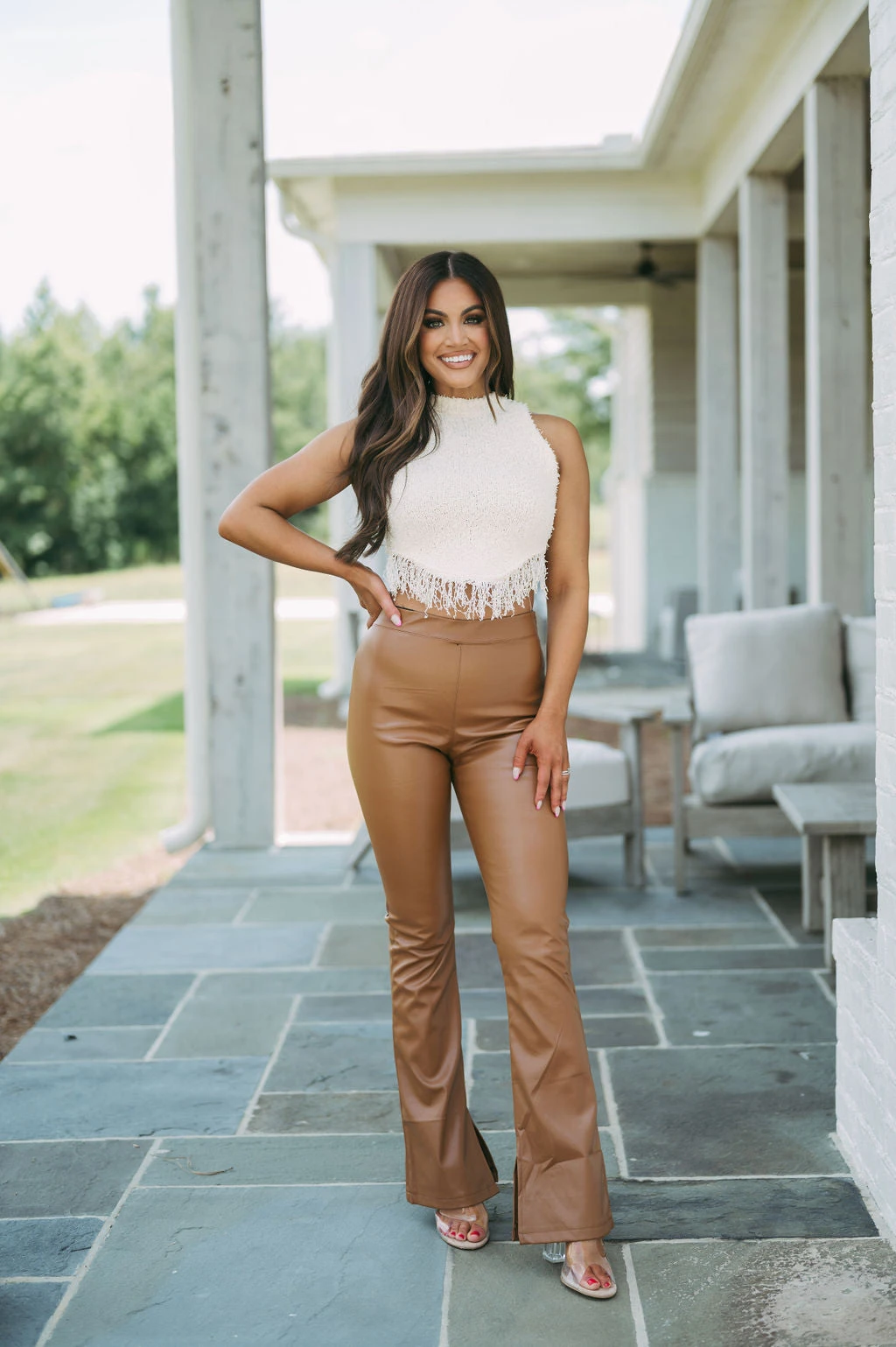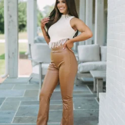 - These August Faux Leather Pants in Camel are stylish, edgy, and comfortable. The high waisted design features a side zipper closure, side slits, and a flared bottom to complete the look. Crafted from high-quality faux leather, they’ll give you a modern look you’ll love.
