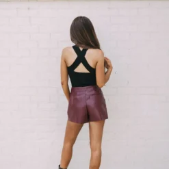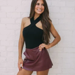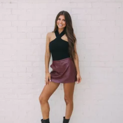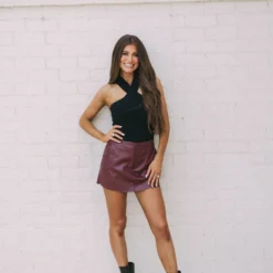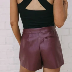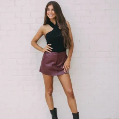 - Be bold and on-trend in the Autumn High Rise Mini Skort- Red Wine. With its rich red wine hue, high rise fit and faux leather accents, you’ll love the way you look and feel in this stylish piece. This mini skort features a button fly closure and two side pockets for added function and flair. Get ready to rock the night in this beautiful skort!