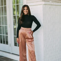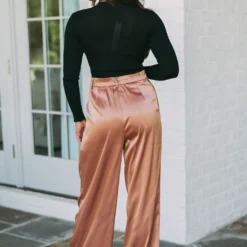 Look fashionable in these Avery High Rise Satin Pants. The soft satin fabric is accentuated with belt loops and elastic waist band in the back, a zipper closure, and pockets. Enjoy the perfect fit and look of fashionable elegance. Wear them to work or a night out on the town.