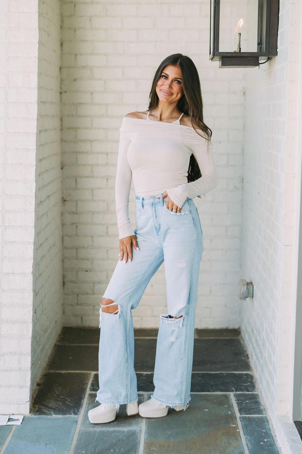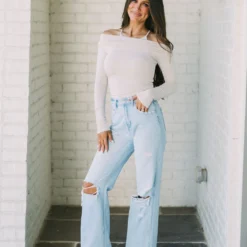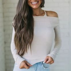 Crafted from a stretchy fabric, this top features an off-the-shoulder design, cropped hemline, fitted tank underneath, and long sleeves. In a creamy hue, this top is perfect for your next night out!