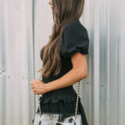 Strut from day to night with style and ease with this eye-catching Cali Tote Bag- Black/Clear. Make a statement with its clear design with black trim and gold accents, convenient front pouch and removable black zipper pouch. Carry beauty and function everywhere you go!