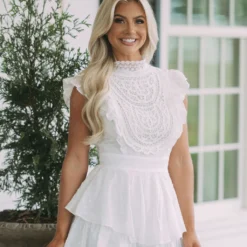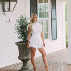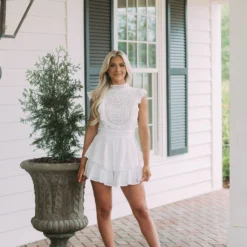 Our Caroline Dotted Romper is the perfect addition to any wardrobe. Look lovely in white with its sleeveless design, crochet detailing, waist tie, and a zipper closure back. Add the playful ruffled detailing for a feminine look!