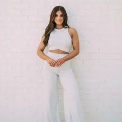 - Introducing the Chanley Ribbed Flare Pants- Ecru! These pants are the perfect combination of comfort and style. Crafted from a ribbed knit material with a hint of stretch, they feature a flattering high waisted fit and wide flared hem. They’re sure to become a wardrobe favorite!