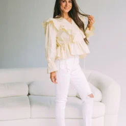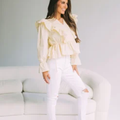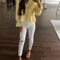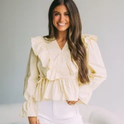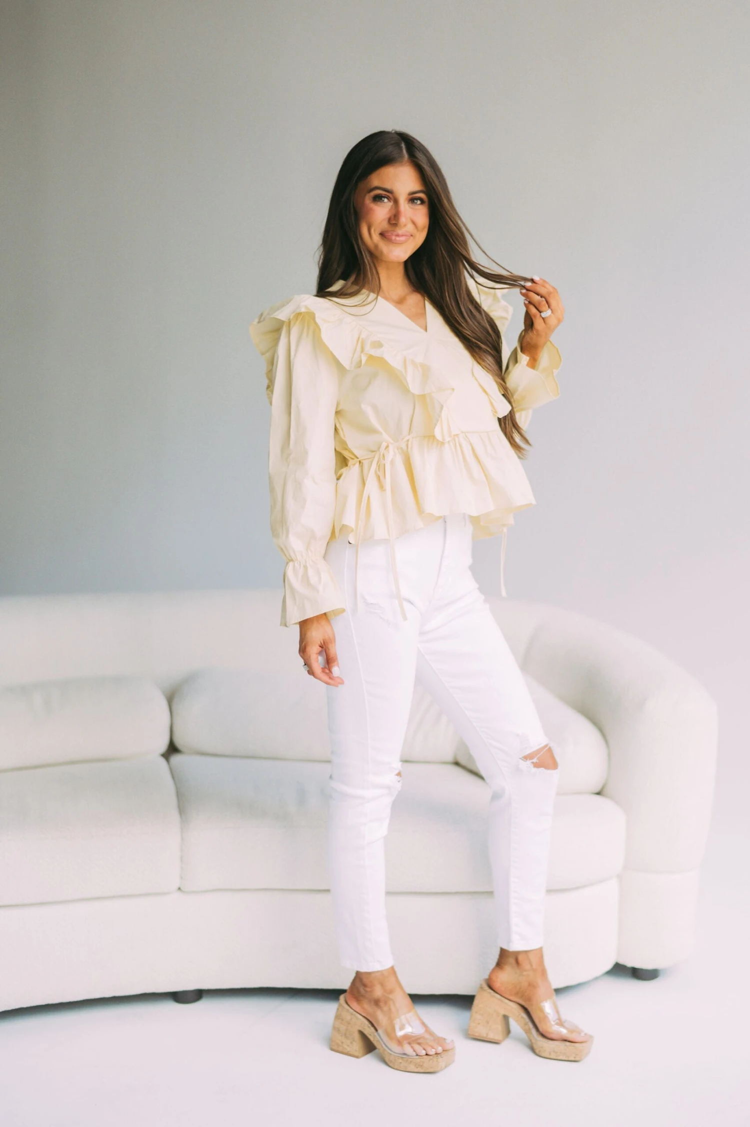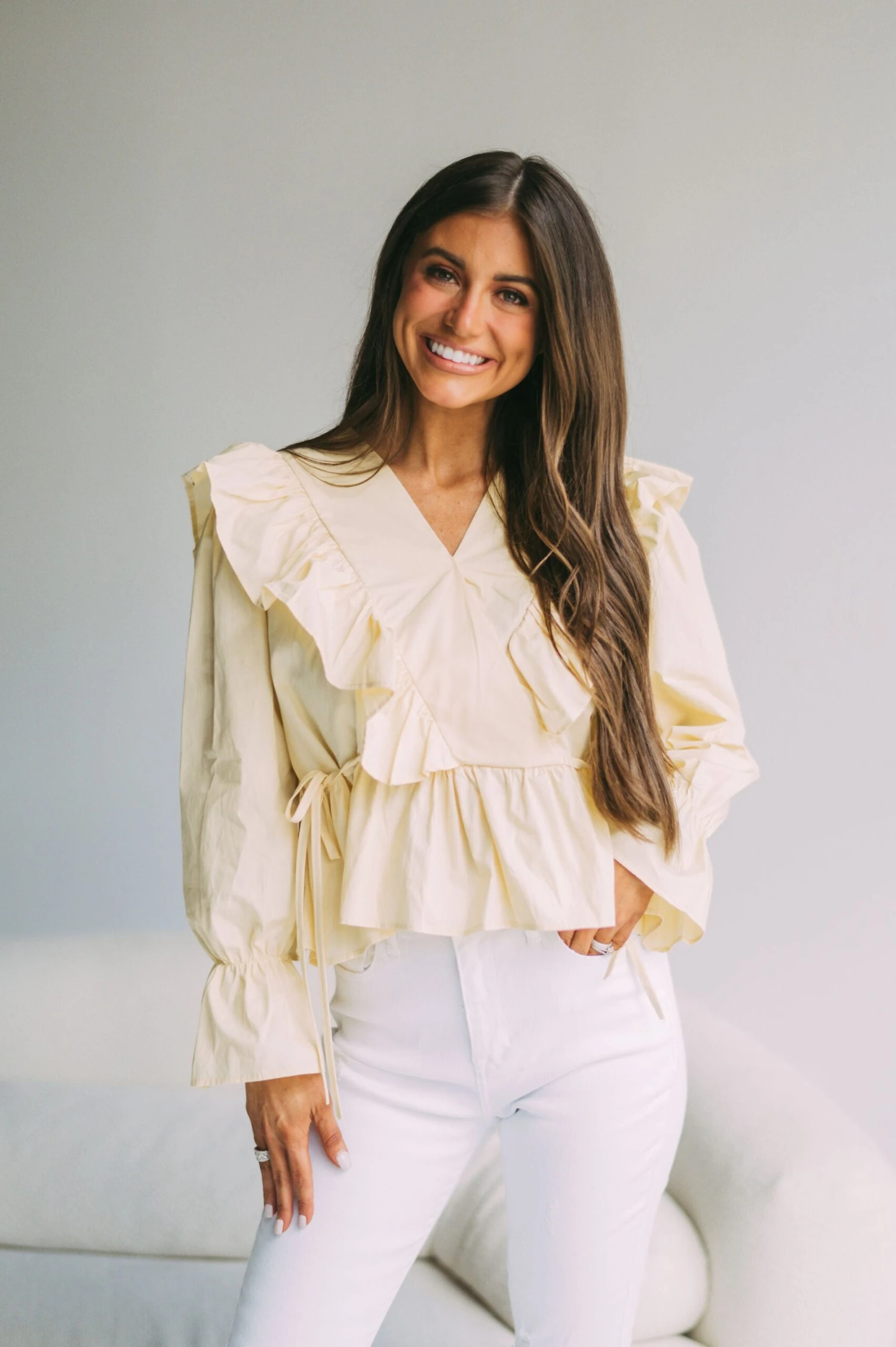 – This Charleston Ruffle Top in cheerful yellow is the perfect blend of classic and chic. Its flattering ruffle bottom, waist tie, and long sleeves create a look that is sure to turn heads. The v-neck is stylish and comfortable. Elevate your wardrobe with this timeless piece.