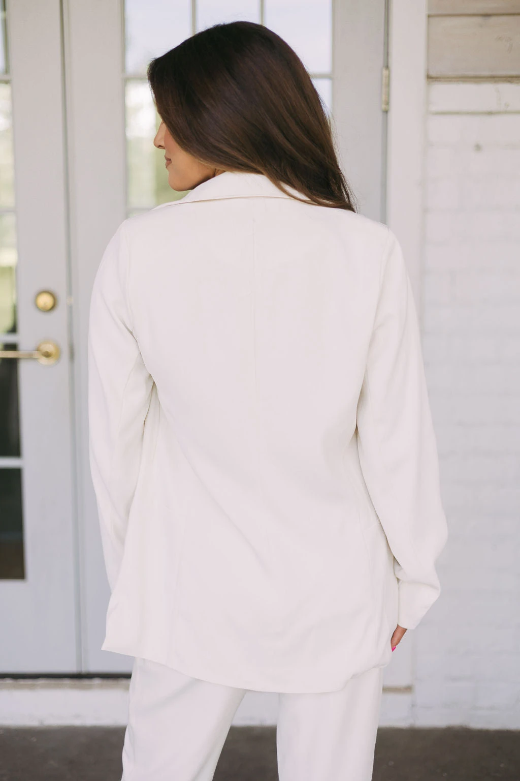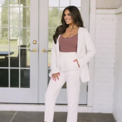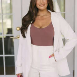 This classic oversized blazer in ecru is a timeless and stylish essential for any wardrobe. With an open front and slightly oversized fit, it’s a versatile and comfortable piece to dress up or down. Add a touch of class to any outfit without sacrificing comfort!
