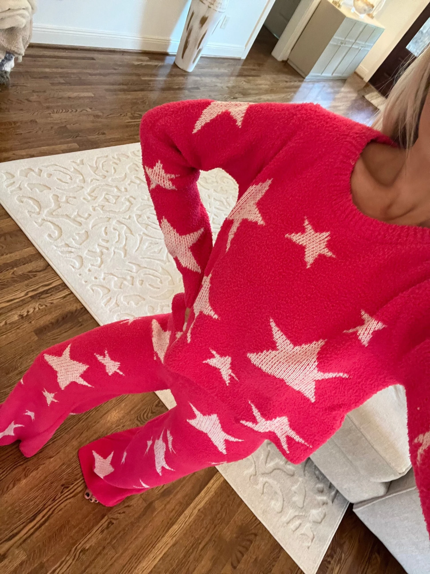 - Experience the perfect lounge look with the Hot Pink Cozy Star Print Pants Set. This set features hot pink sherpa with a star print, flared bottom hem, and a stretchy, high waisted fit for maximum comfort. Look and feel stunning!