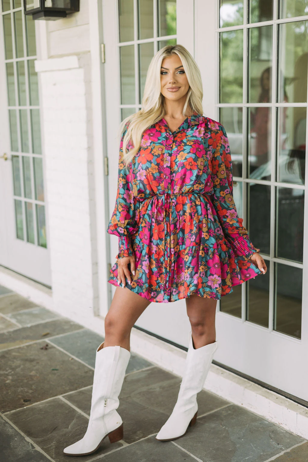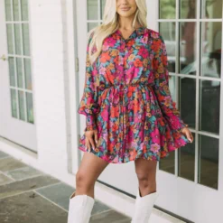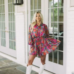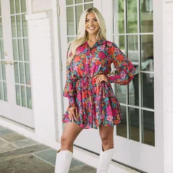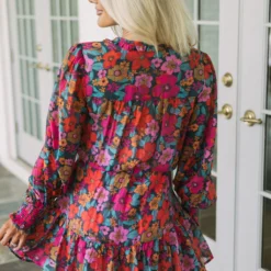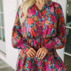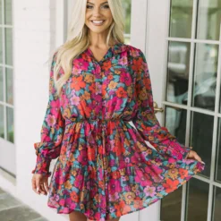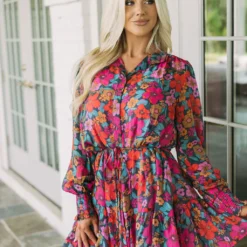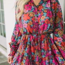 Make a statement in this gorgeous floral dress! The vibrant teal, rust, and pink design is eye-catching, while a button up closure and dainty waist tie provide a flattering fit. Plus, a lavender lined slip with adjustable straps ensures you stay comfortable all day. Express yourself in style with this beautiful dress!