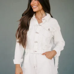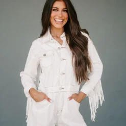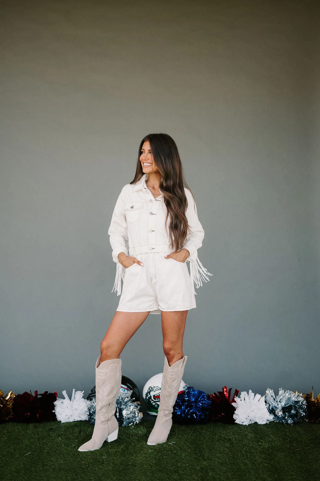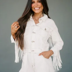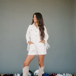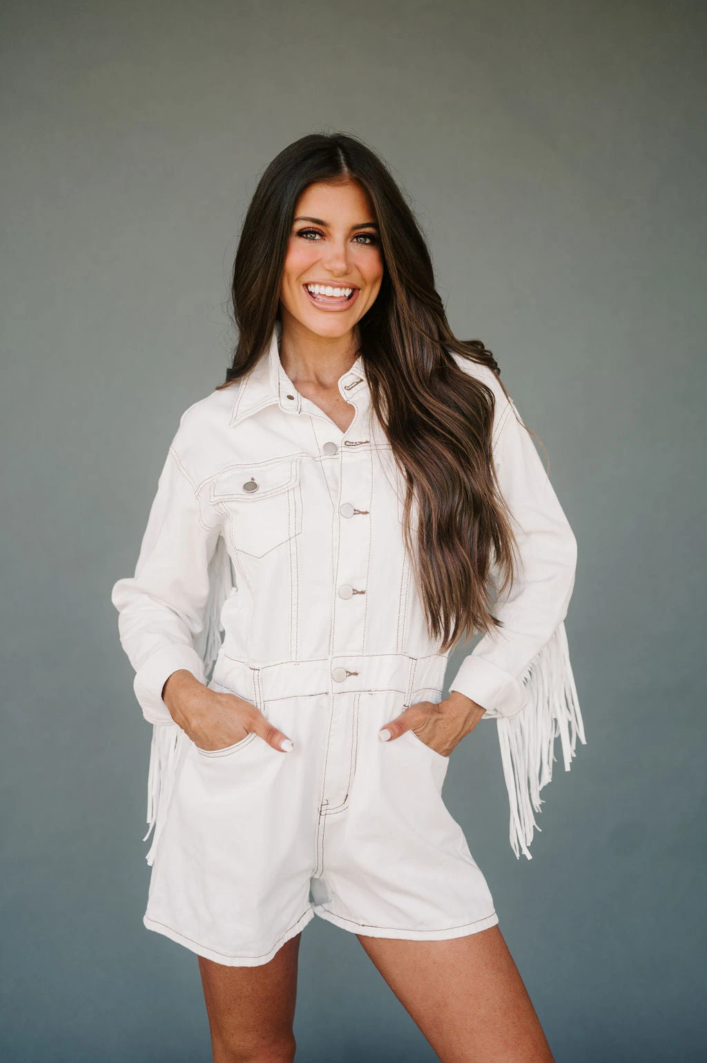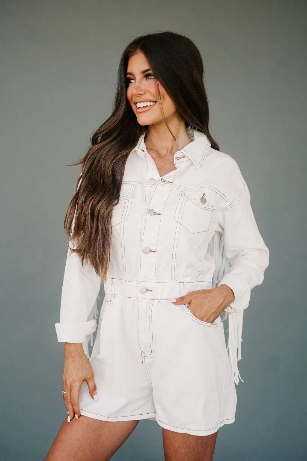 Be effortlessly stylish in this white denim romper. Featuring exposed seams and long sleeves with fringe accents, this romper is a perfect twist on the classic denim look. The button and zipper closure front with pockets make it practical and stylish. Add a touch of personality to your wardrobe today!