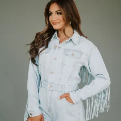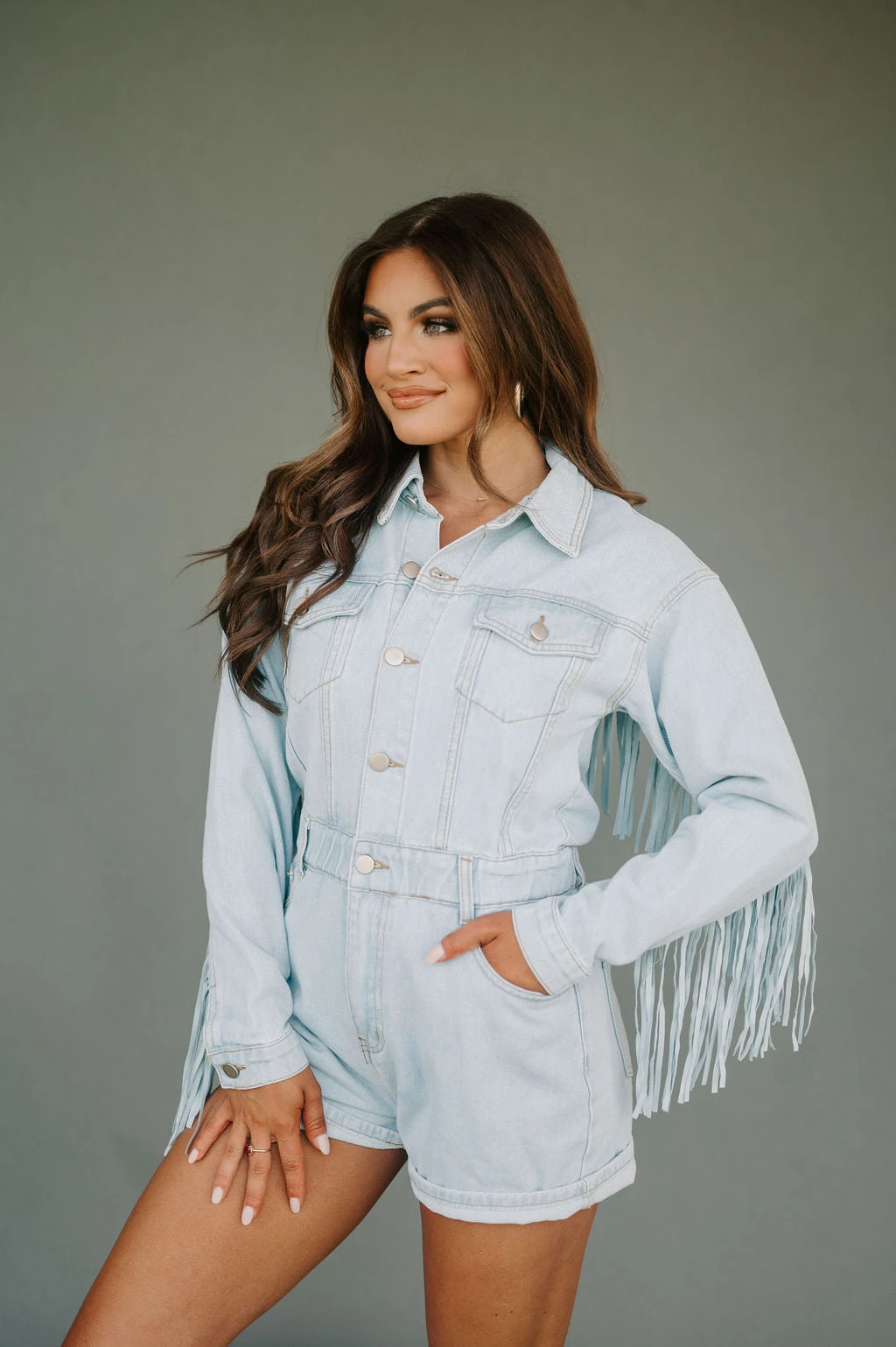 Be effortlessly stylish in this denim romper. Featuring exposed seams and long sleeves with fringe accents, this romper is a perfect twist on the classic denim look. The button and zipper closure front with pockets make it practical and stylish. Add a touch of personality to your wardrobe today!