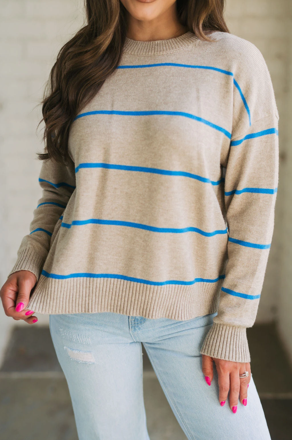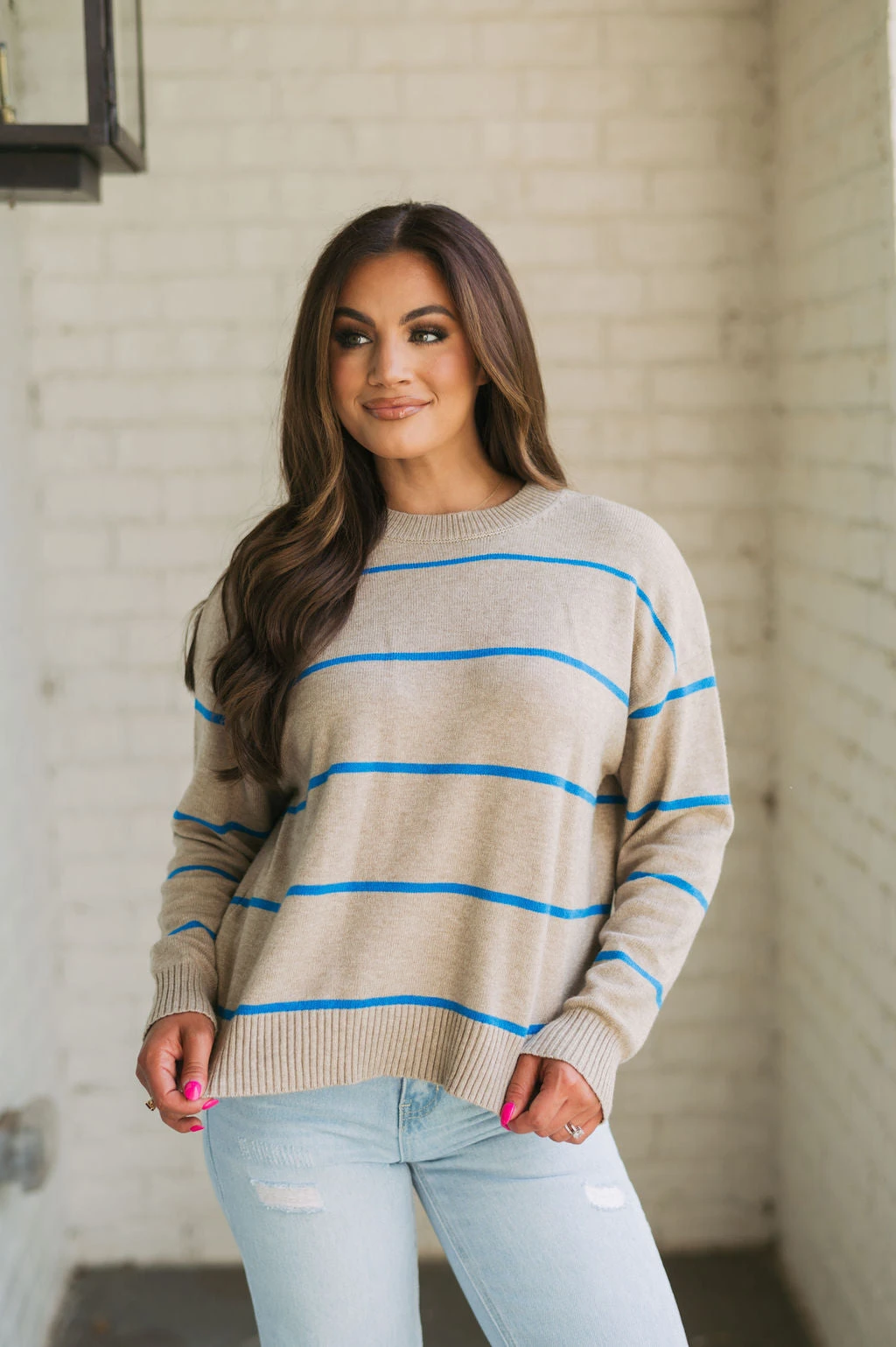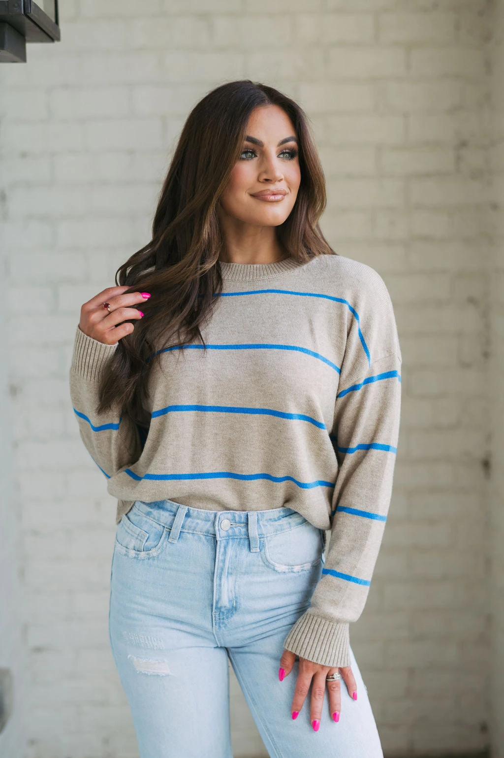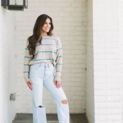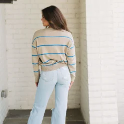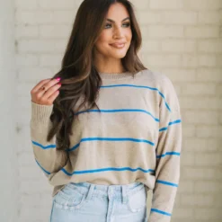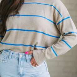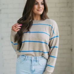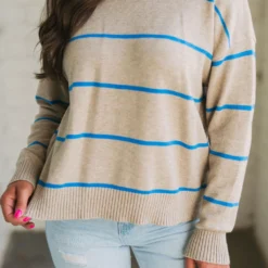 Be ready for the cool weather in style with the Evie Striped Sweater! This cozy garment features a classic taupe and blue striped pattern with ribbed trim for added warmth and comfort. Enjoy the latest fashion trends in luxury and comfort today!