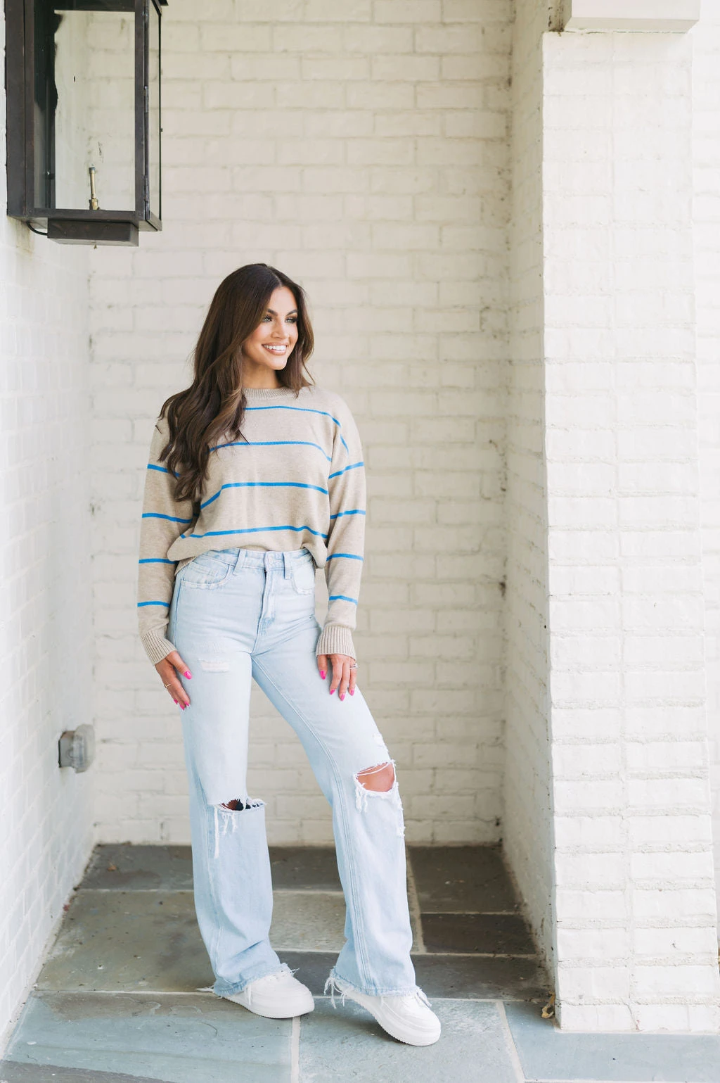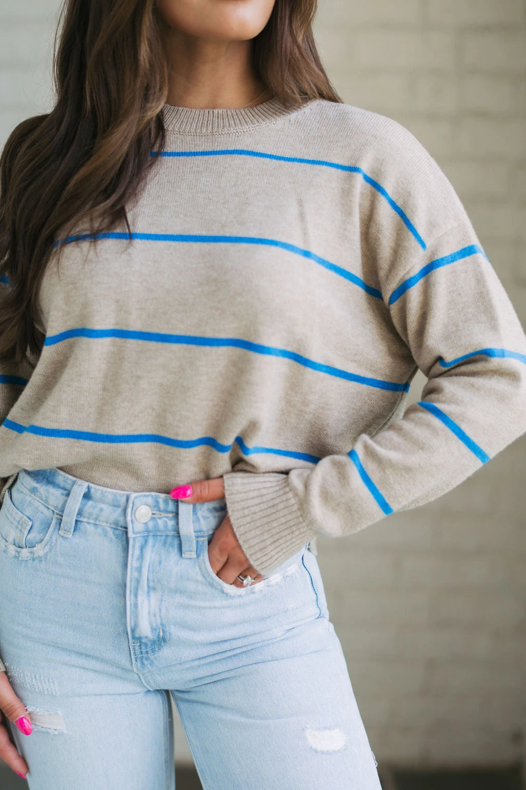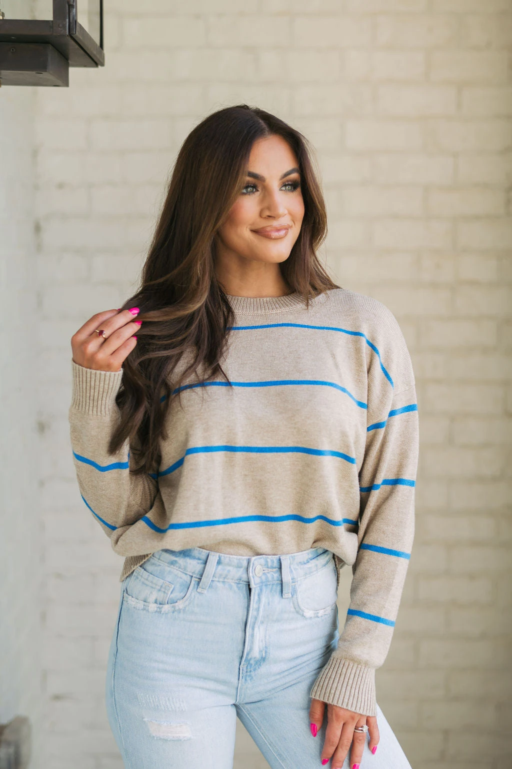 Be ready for the cool weather in style with the Evie Striped Sweater! This cozy garment features a classic taupe and blue striped pattern with ribbed trim for added warmth and comfort. Enjoy the latest fashion trends in luxury and comfort today!
