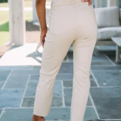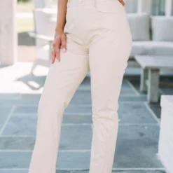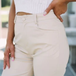 - These timeless, beige faux leather pants feature a high waist and a classic straight leg fit. The button fly closure creates a polished look, making these versatile pants perfect for a range of occasions.