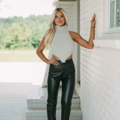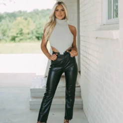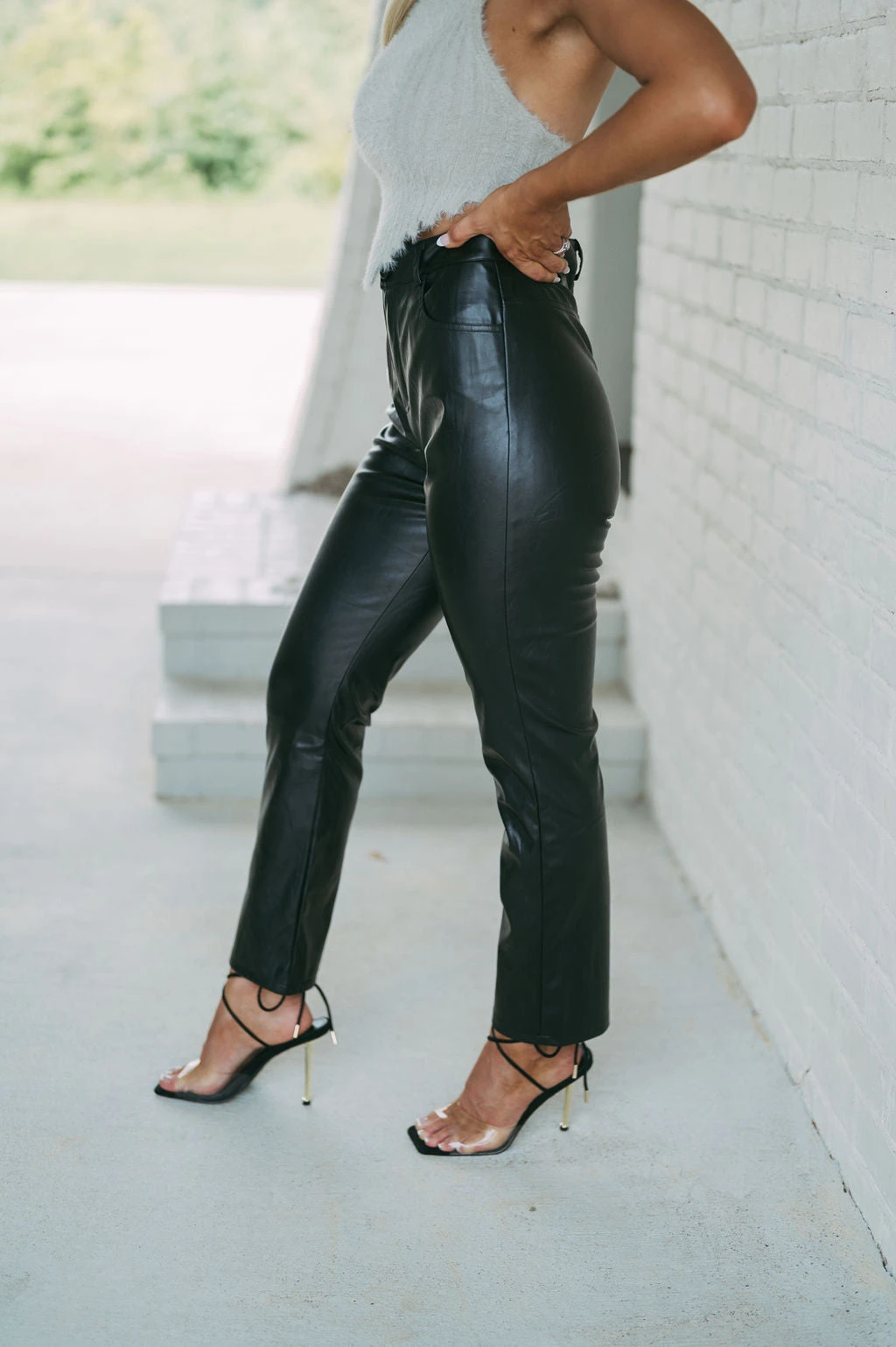 - These timeless, black faux leather pants feature a high waist and a classic straight leg fit. The button fly closure creates a polished look, making these versatile pants perfect for a range of occasions.