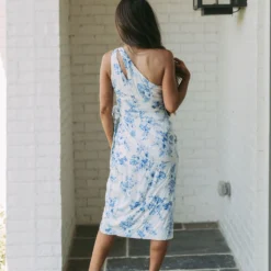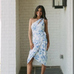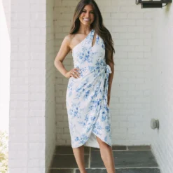 Look sophisticated and feminine in this one-shoulder midi dress with a tulip hem skirt. This stunning blue and white floral printed dress features a chic cut out along the chest and a side zipper closure for an effortless fit. The tulip hem skirt ties at the side, creating a captivating silhouette!