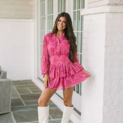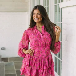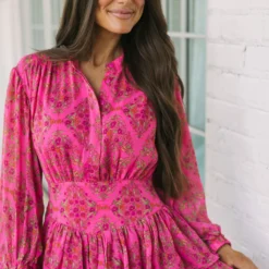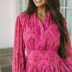 The Francie Floral Dress is the perfect way to stand out! Crafted from a beautiful hot pink, green, and orange floral printed fabric, the dress features a button up closure front, a ruffled skirt, and a side zipper closure. Add a pop of vibrant color to your wardrobe with this show-stopping dress!