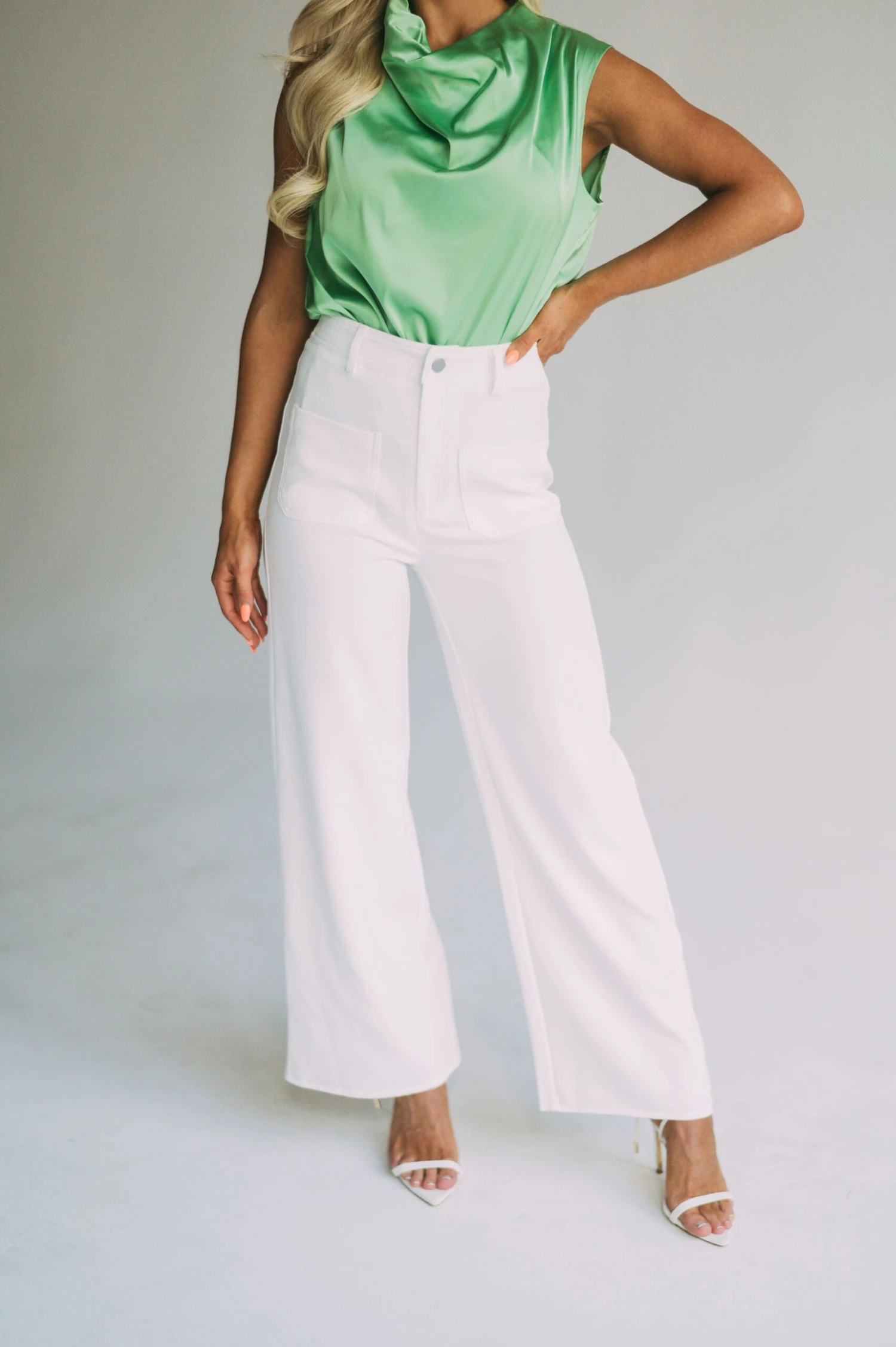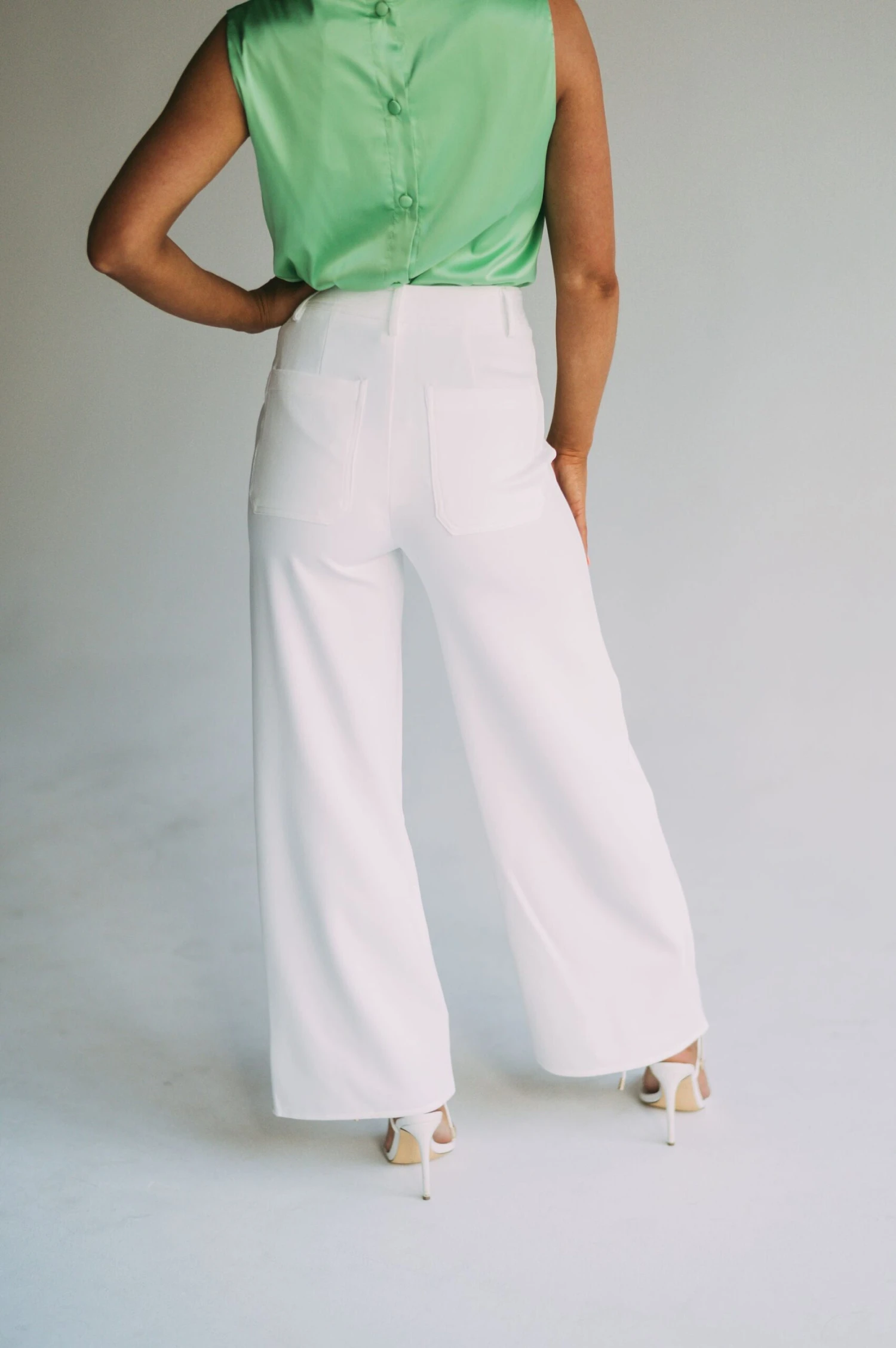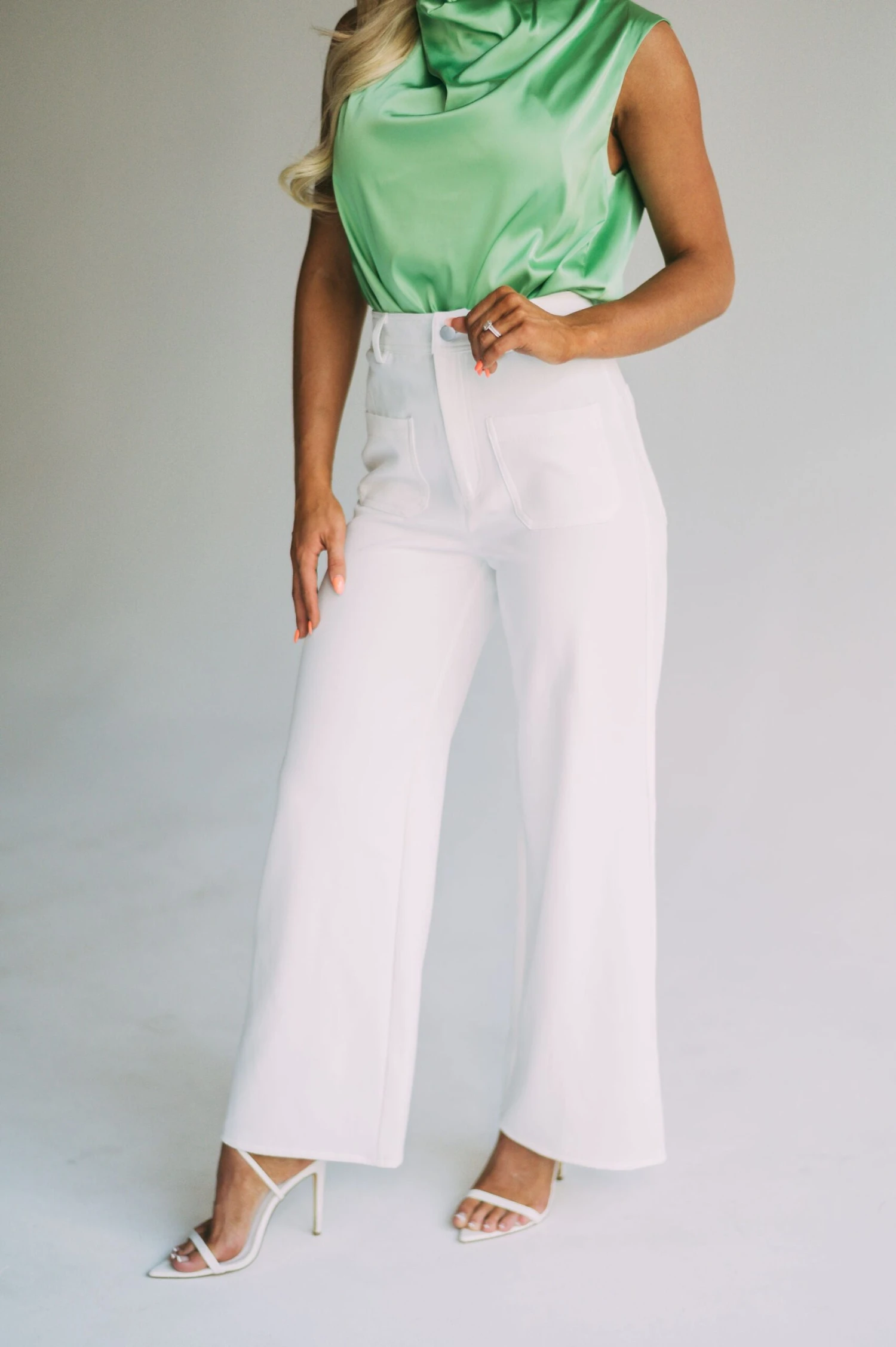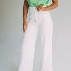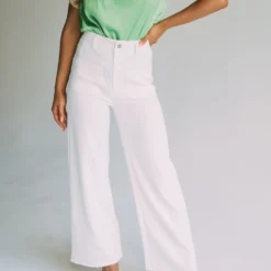 Designed for maximum comfort, these white wide-leg pants feature a flattering high-waisted fit and front pockets. The crop bottom hem and quality zipper/button closure provide the perfect finishing touch. Ideal for the modern woman’s wardrobe.