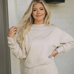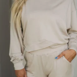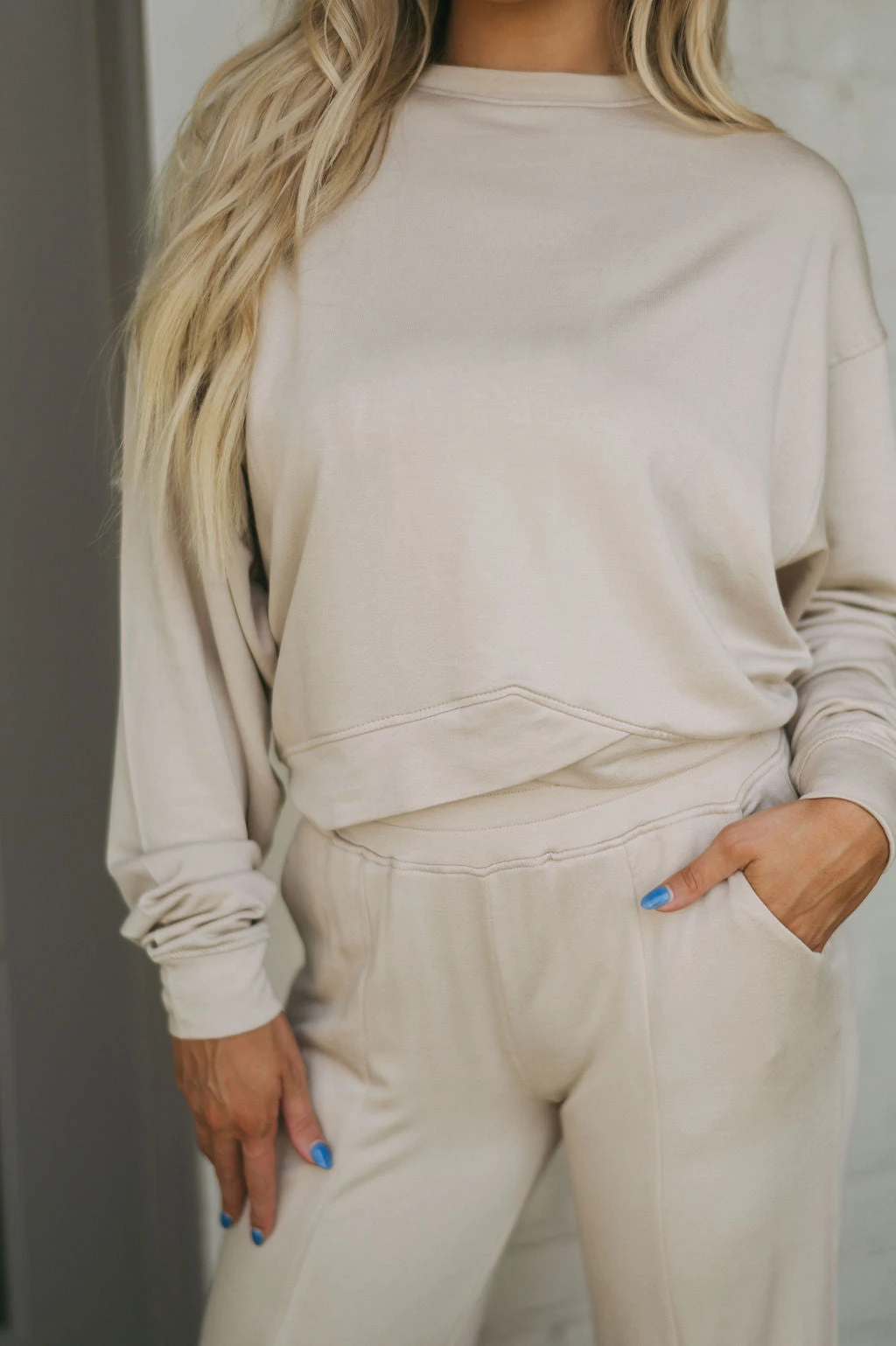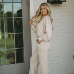 - ultra comfy high waisted natural colored flared lounge pants featuring a front slit detail at the bottom and stretchy banded waist