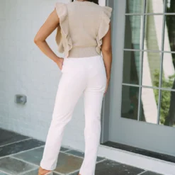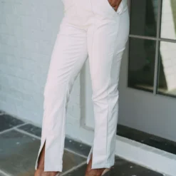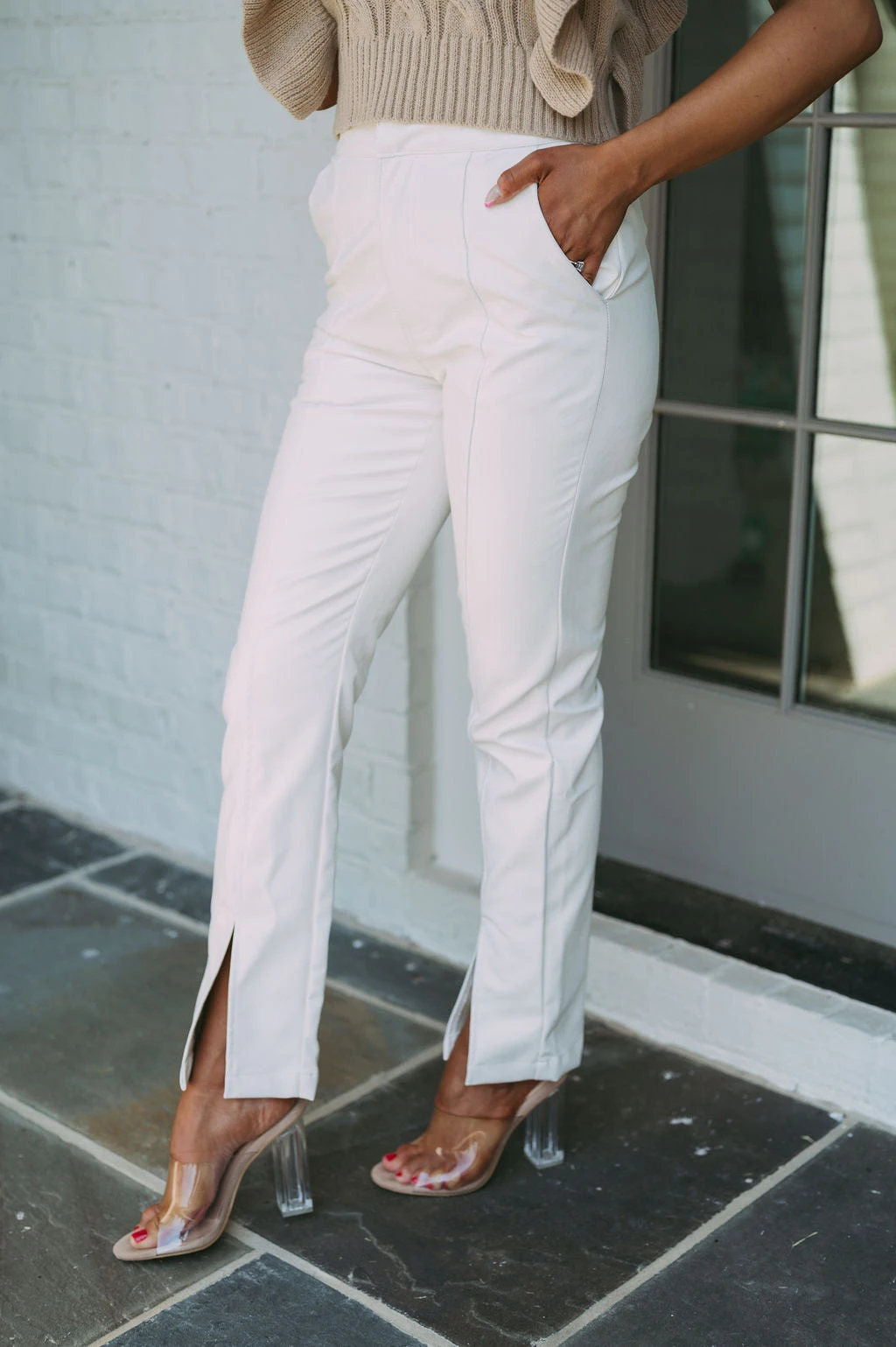 Discover timeless style with these ivory leather pants. High waisted with a flattering front slit and zipper closure, these pants are designed to make you stand out. Perfect for a night out or special occasion. Stand out from the crowd!