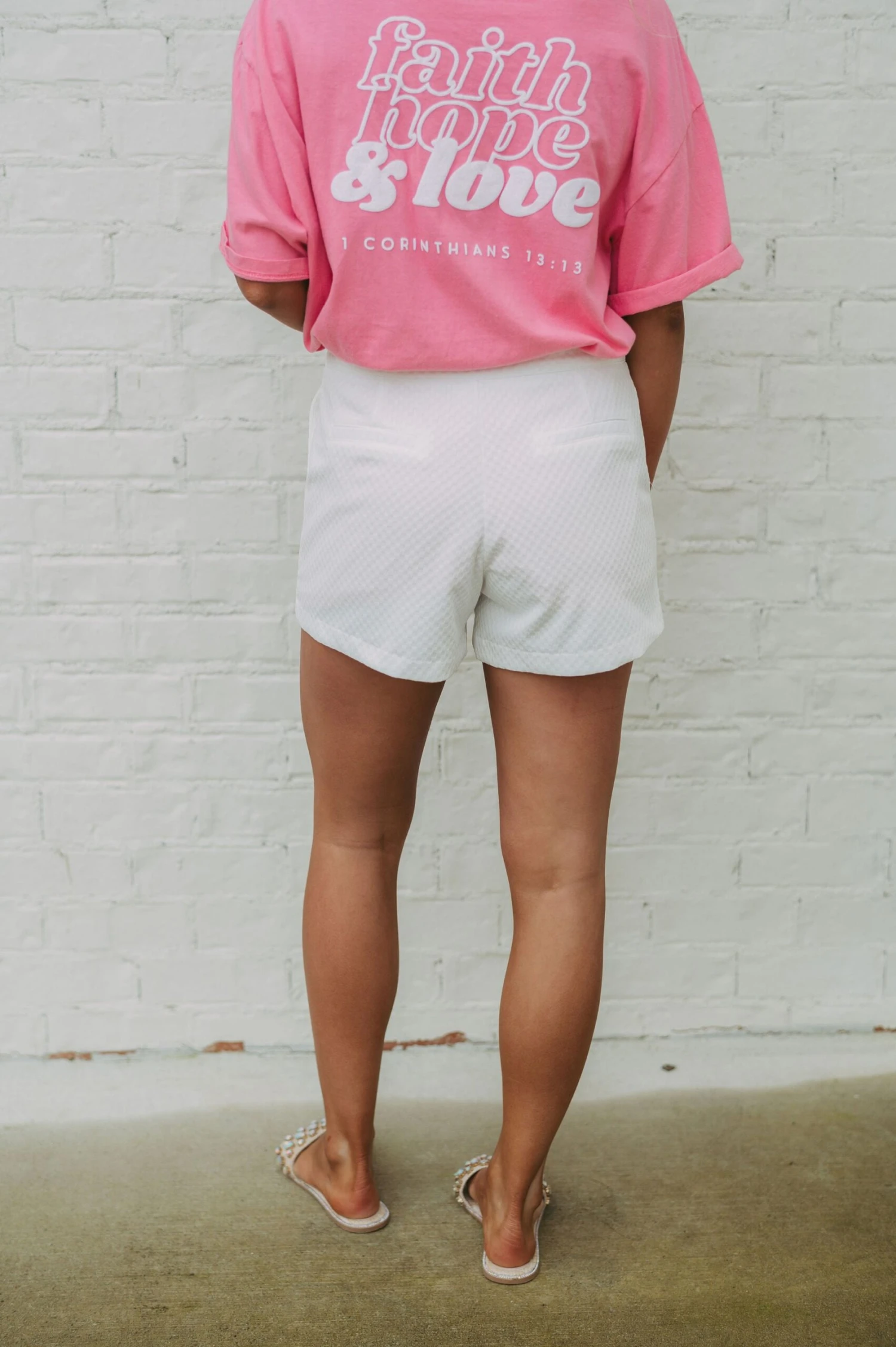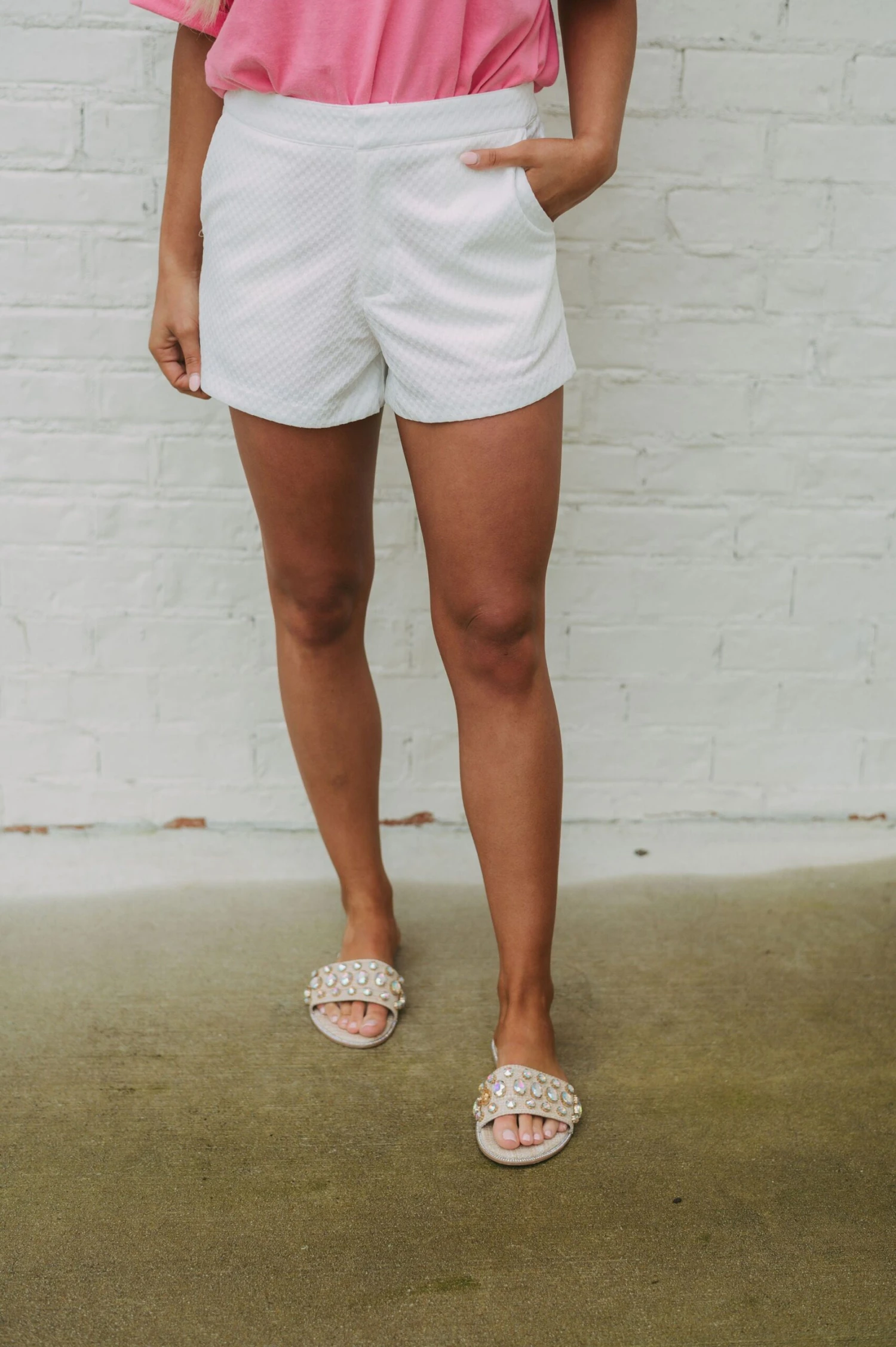 - The Greer Textured Shorts are an essential for anyone’s wardrobe. The white color and textured material make them timeless and perfect for dressing up or down. Cut with a mid-rise waist and finished with a clasp closure, side pockets, and a relaxed fit, these versatile shorts are the perfect choice.