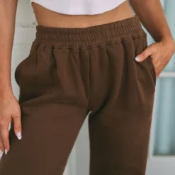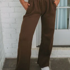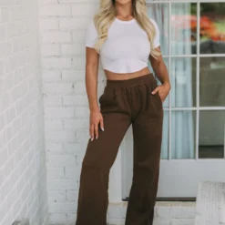 The Helen Lounge Pants-Chocolate are perfect for relaxing in style. The elastic high waistband ensures a perfect fit, and two pockets for storing small items. Offered in a subtle chocolate brown finish, these pants will have you feeling comfortable and fashionable!