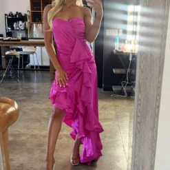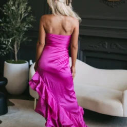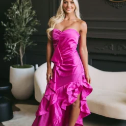 - Make a bold statement in this ravishing high-low satin dress in fuchsia! Its strapless design, ruched ruffles, and side zipper closure give you a flattering fit that’s sure to turn heads. Dare to stand out – order now!
