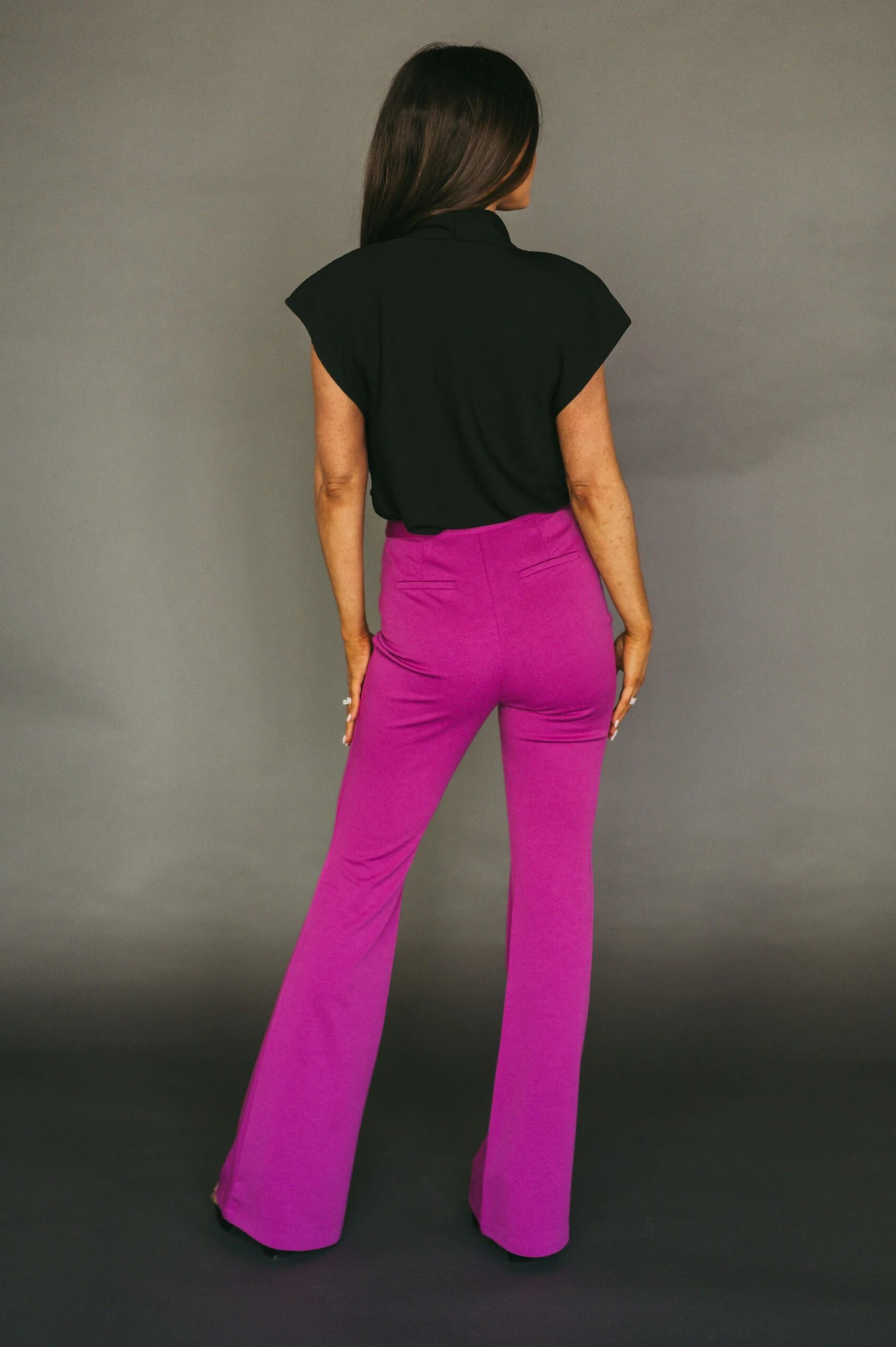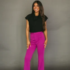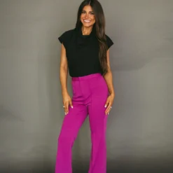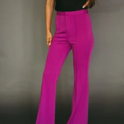 The High Rise Front Seam Pants- Magenta from [Merchant name] feature a high-waisted fit that provides an improved shape and enhanced coverage. The front seam and flared bottom hem further flatter your silhouette, while the stretchy fabric and zipper closure ensure comfort and ease. These pants provide a polished, stylish look you’ll love.