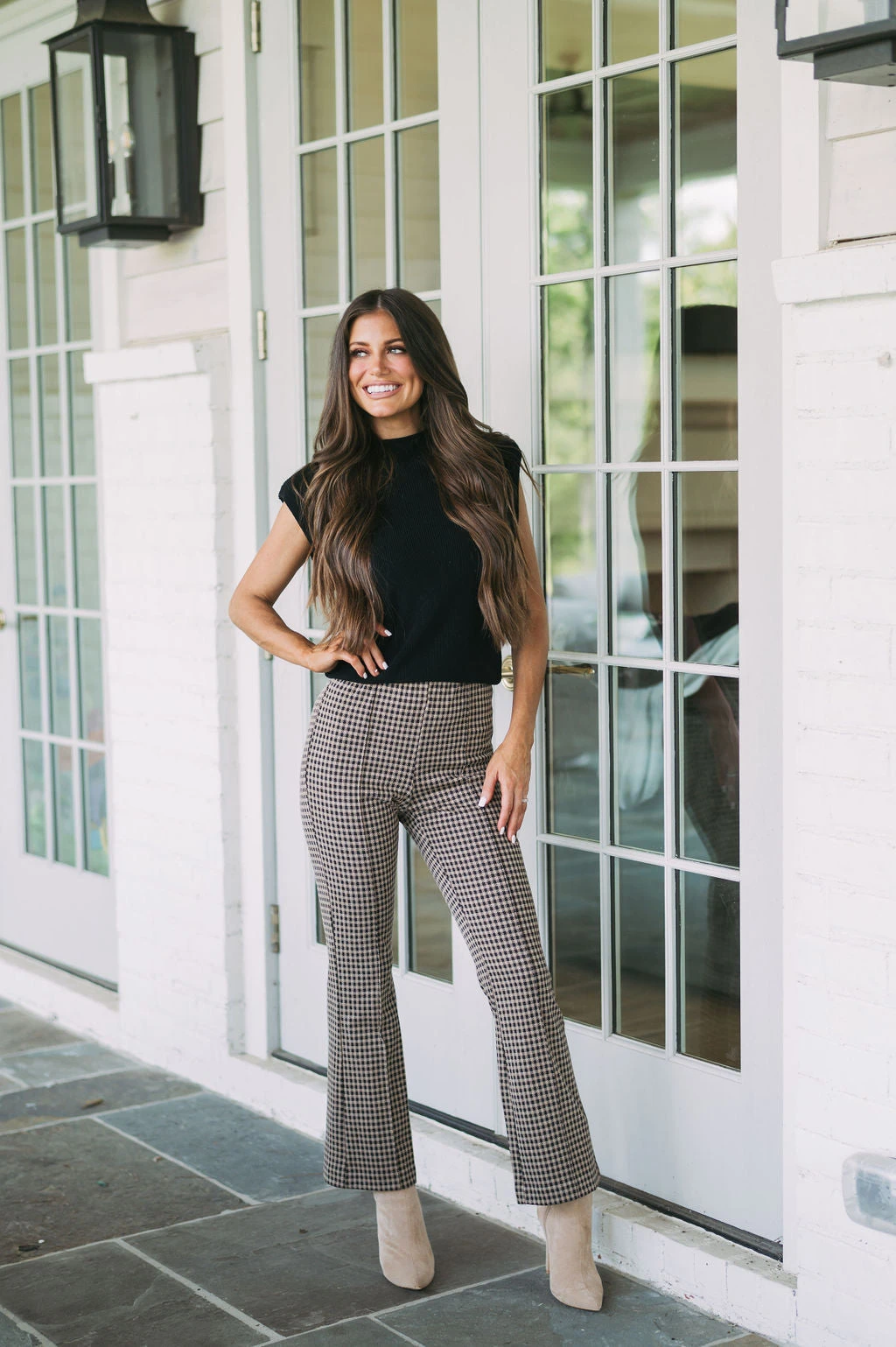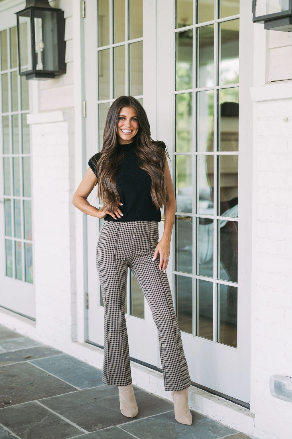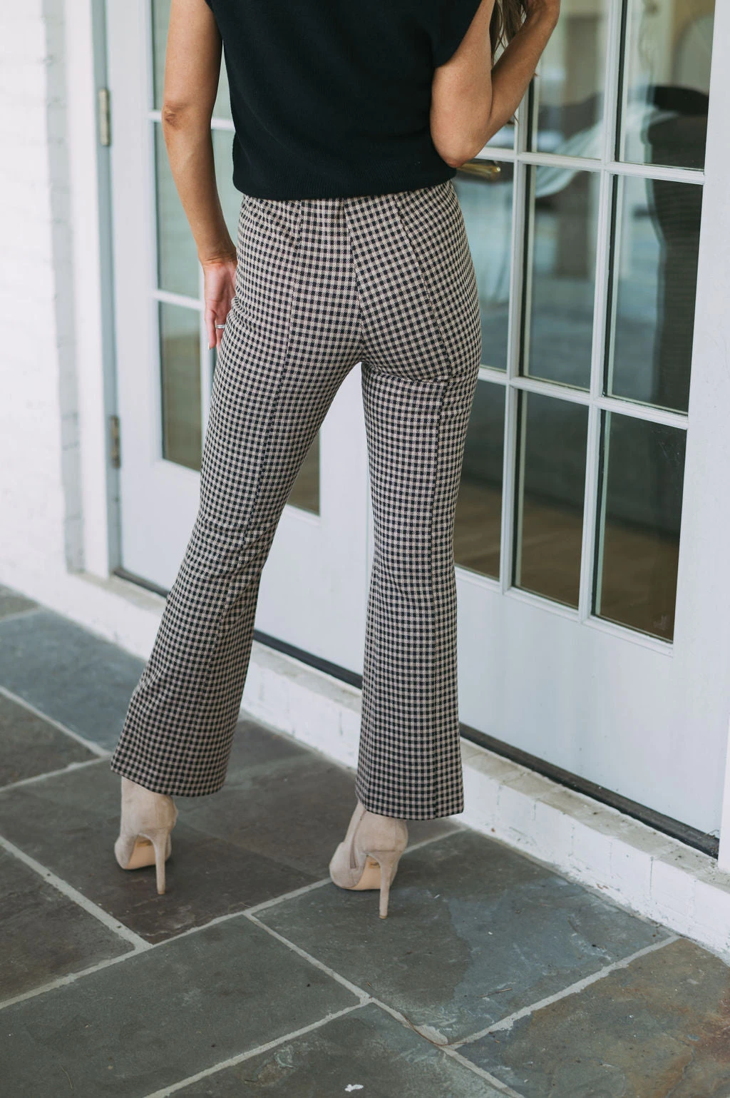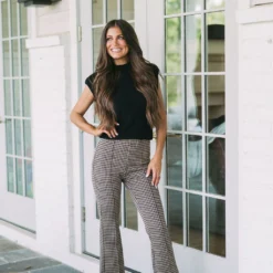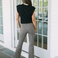 Take your style to the next level with these Houndstooth Flared Pants! In classic black and brown houndstooth print, these pants are the perfect addition to your wardrobe. With their flattering high elastic waistband and slightly flared legs, you’ll look and feel amazing. Rock the ultimate fashion statement!