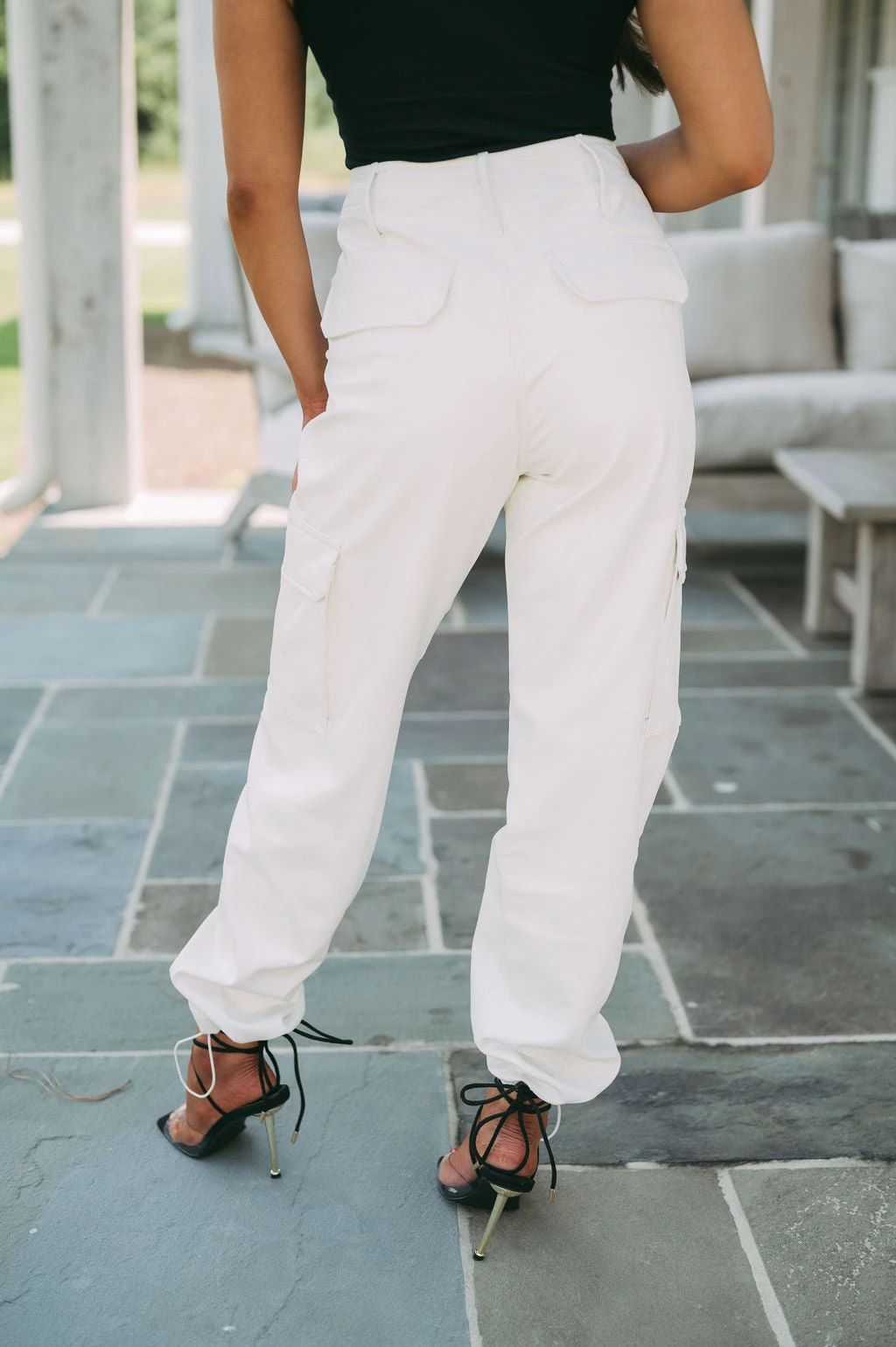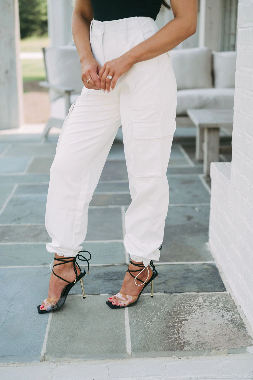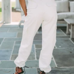 - Make a statement in our stylish Jennifer Faux Leather Joggers. Crafted from an off white faux leather fabric, these joggers will elevate any outfit. Featuring a high waisted fit, button fly closure, side pockets and adjustable bottom, you’ll look and feel your best.Â