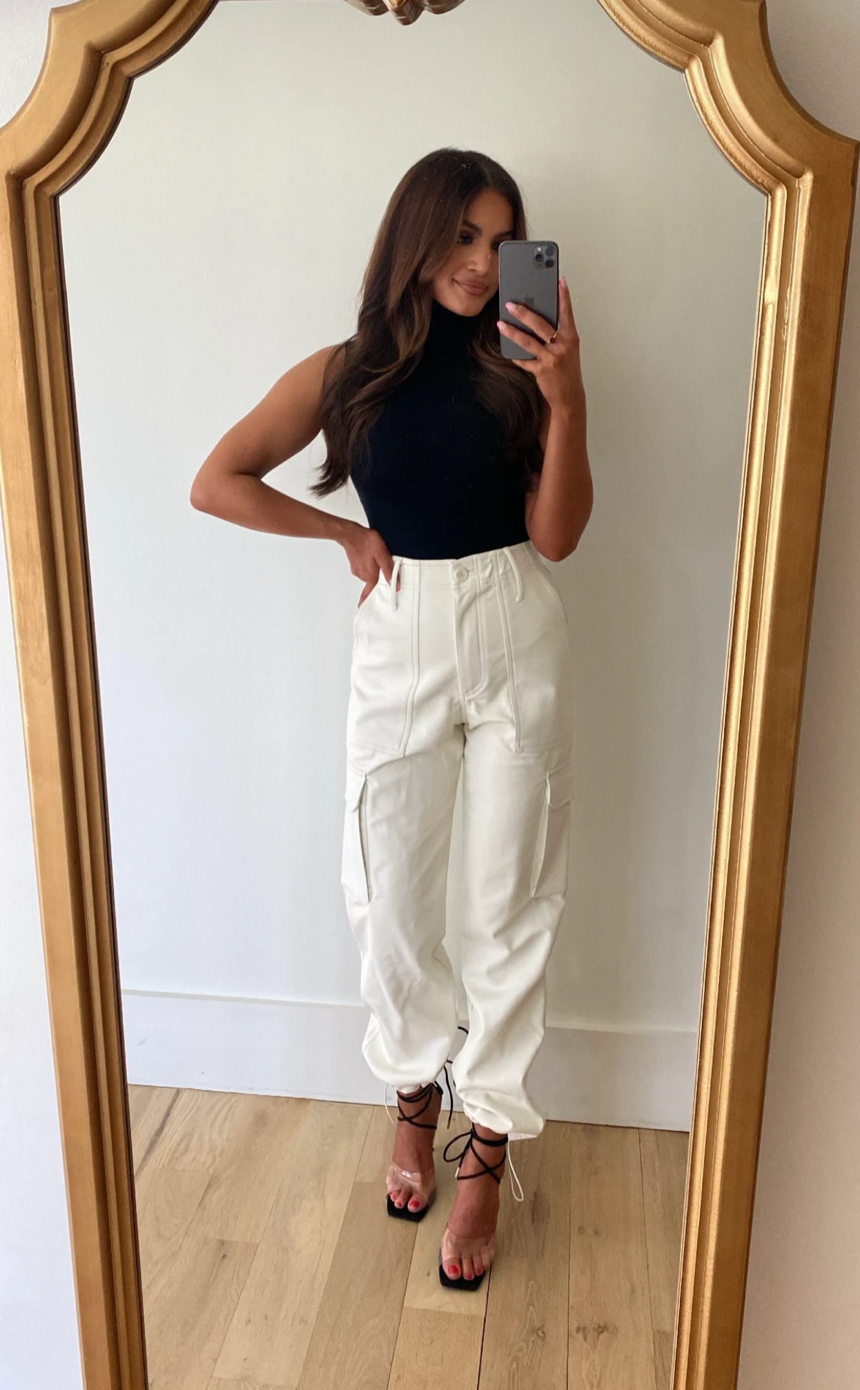 - Model is 5’4″ with a 25″ waist and 38″ hips wearing a size small.