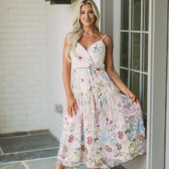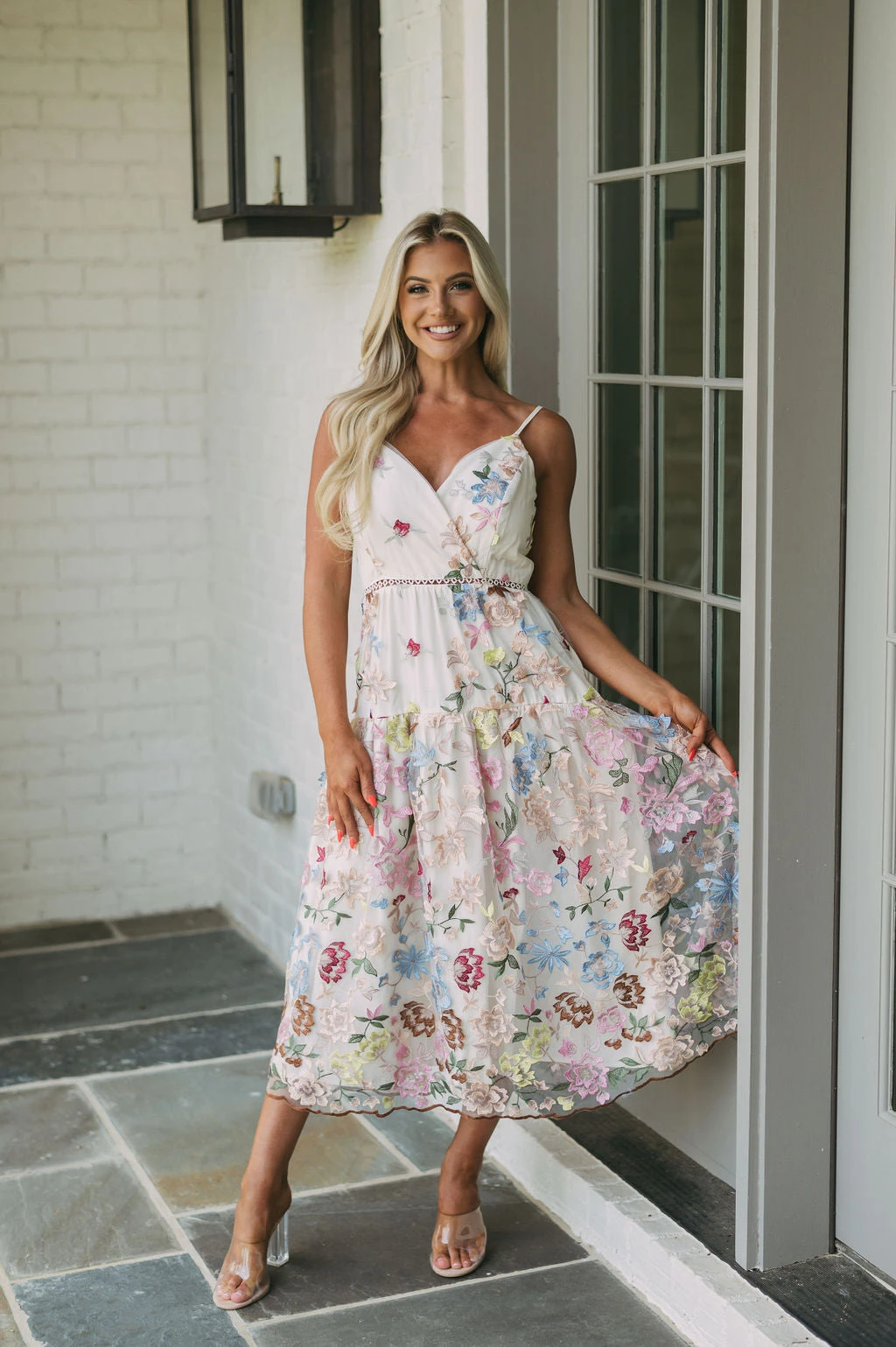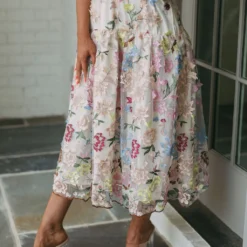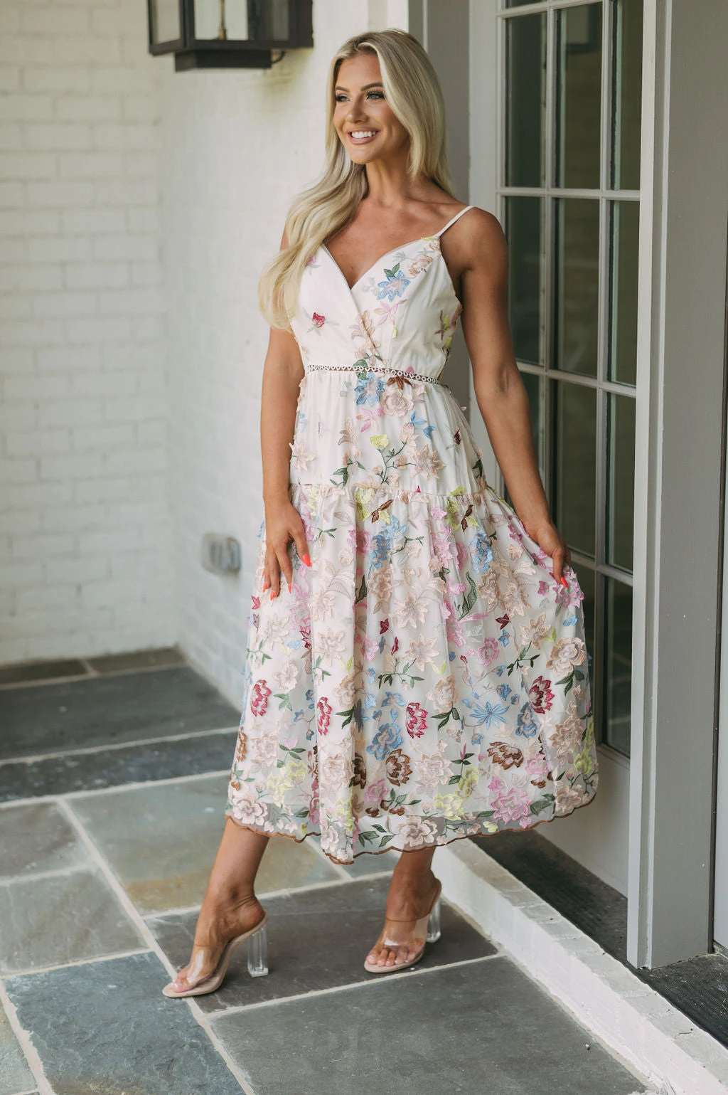 This Kelsey Floral Midi Dress is perfect for making a statement. Its ivory mesh is adorned with multi-colored floral embellishments, adjustable spaghetti straps, eyelet cut out detailing, and a zipper closure back. A stunning look for any special occasion!