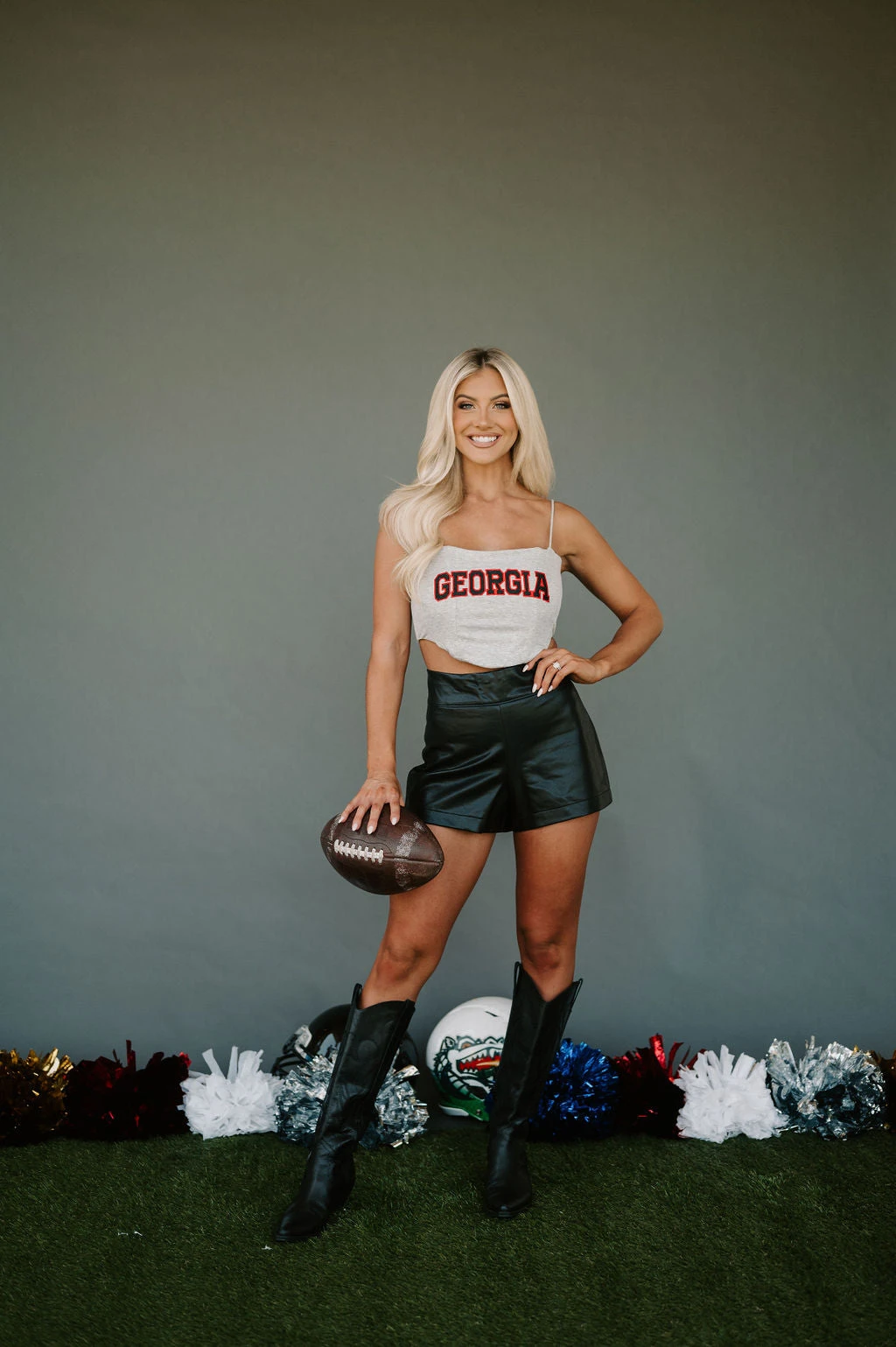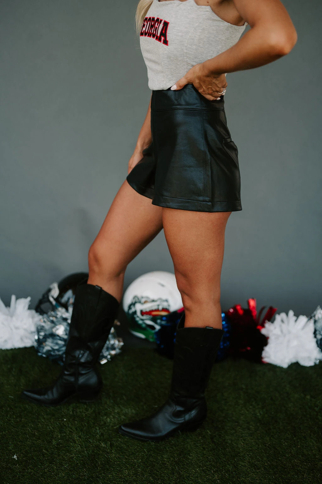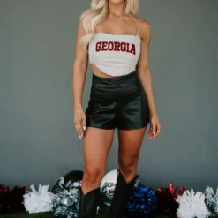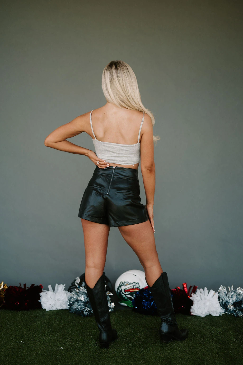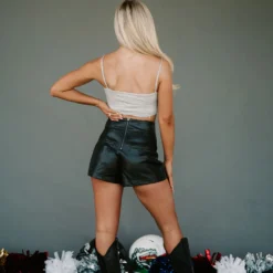 - Fall in love with our Kramer Faux Leather Shorts- Black – the perfect way to add an edge to any wardrobe. Made from luxe faux leather, these high-waisted shorts feature a back zipper closure to ensure a comfortable yet stylish fit. Timeless black shade adds a modern touch to your look.