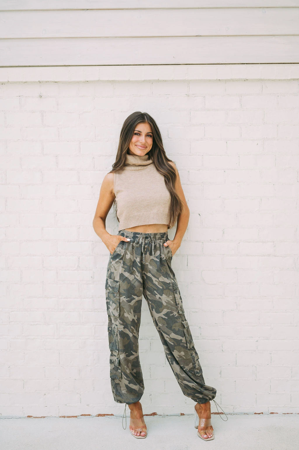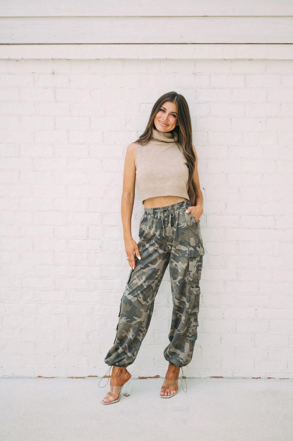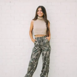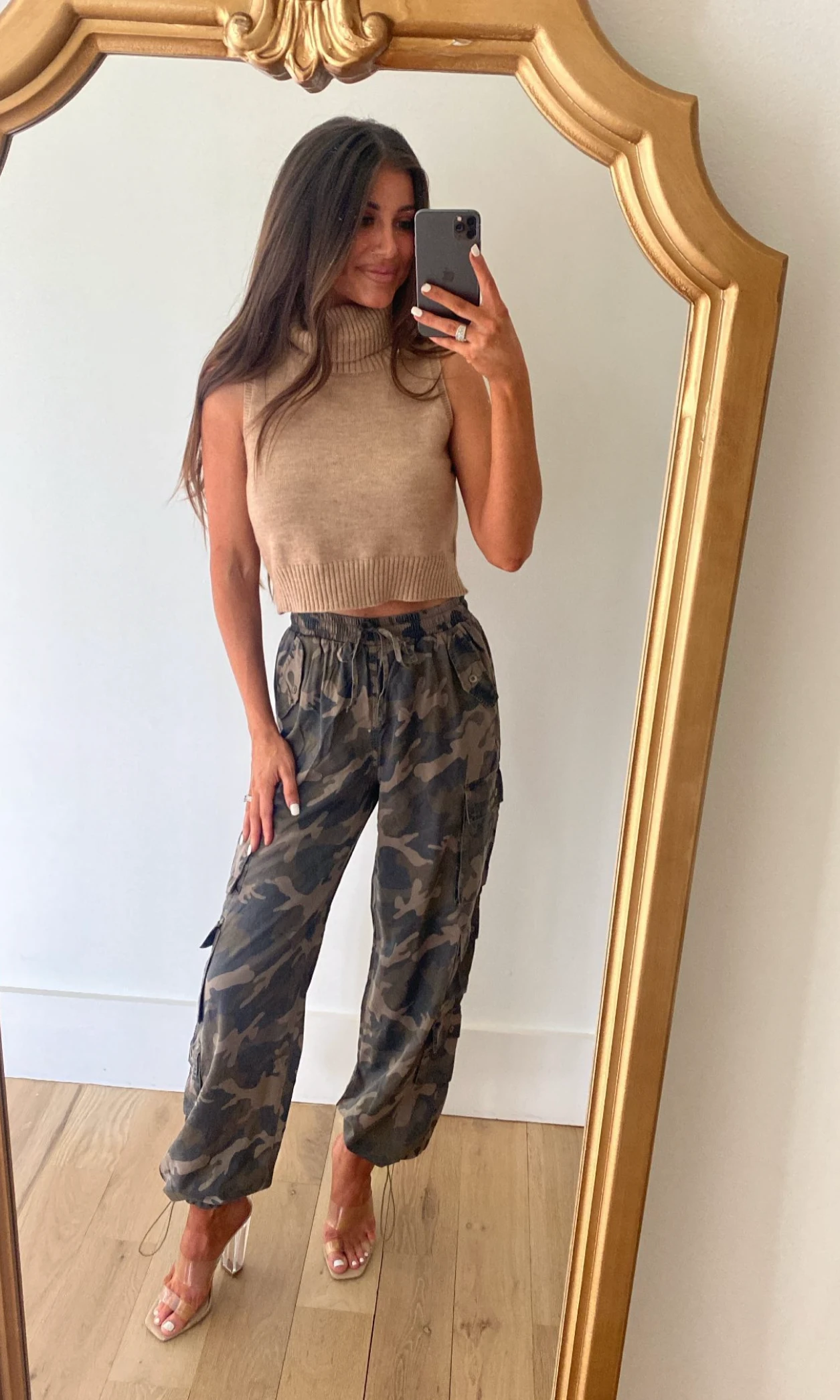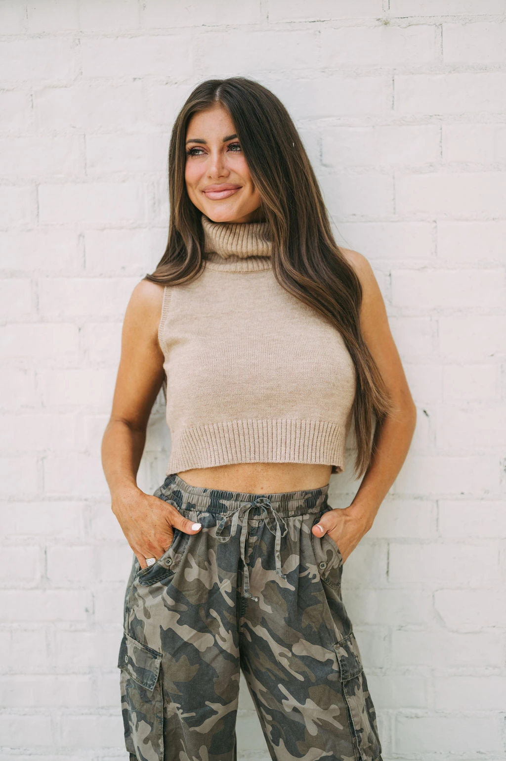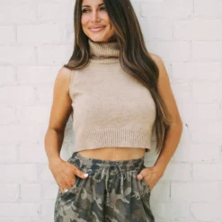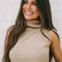 - Stay cozy and stylish in the Kramer Sleeveless Sweater! This mocha-hued staple features a classic turtleneck and cropped fit, giving you a timeless look that will instantly elevate any outfit.Â