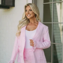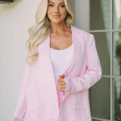 This eyelet lace cuff linen blazer is perfect for a fashionable and professional look. The luxuriously soft pink linen fabric hangs beautifully and the front pockets and button closure front make it comfortable and easily adjustable. The collared neckline provides a sophisticated touch.