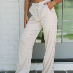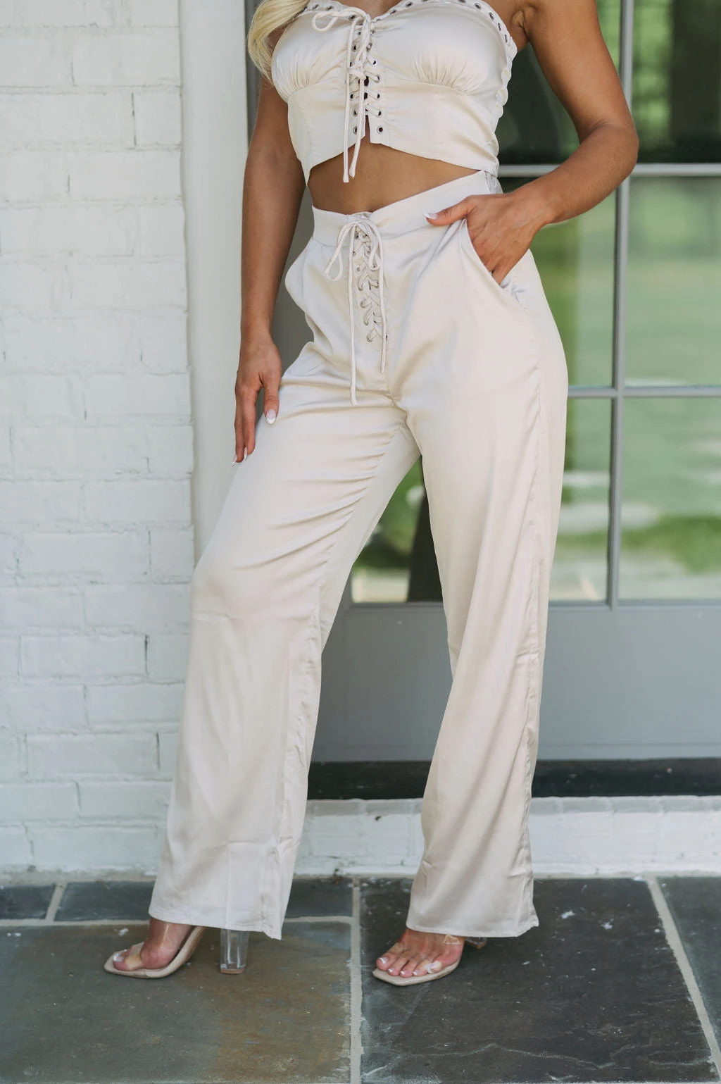 This Lace Up Crop Top & Pants Set-Beige is the perfect combo of stylish and sophisticated. The beige satin two piece has a cropped top with cut out detailing, lace up front, and back zipper closure. The high waisted pants have pockets, a lace up tie front, and side zipper closure for comfortable wear!
