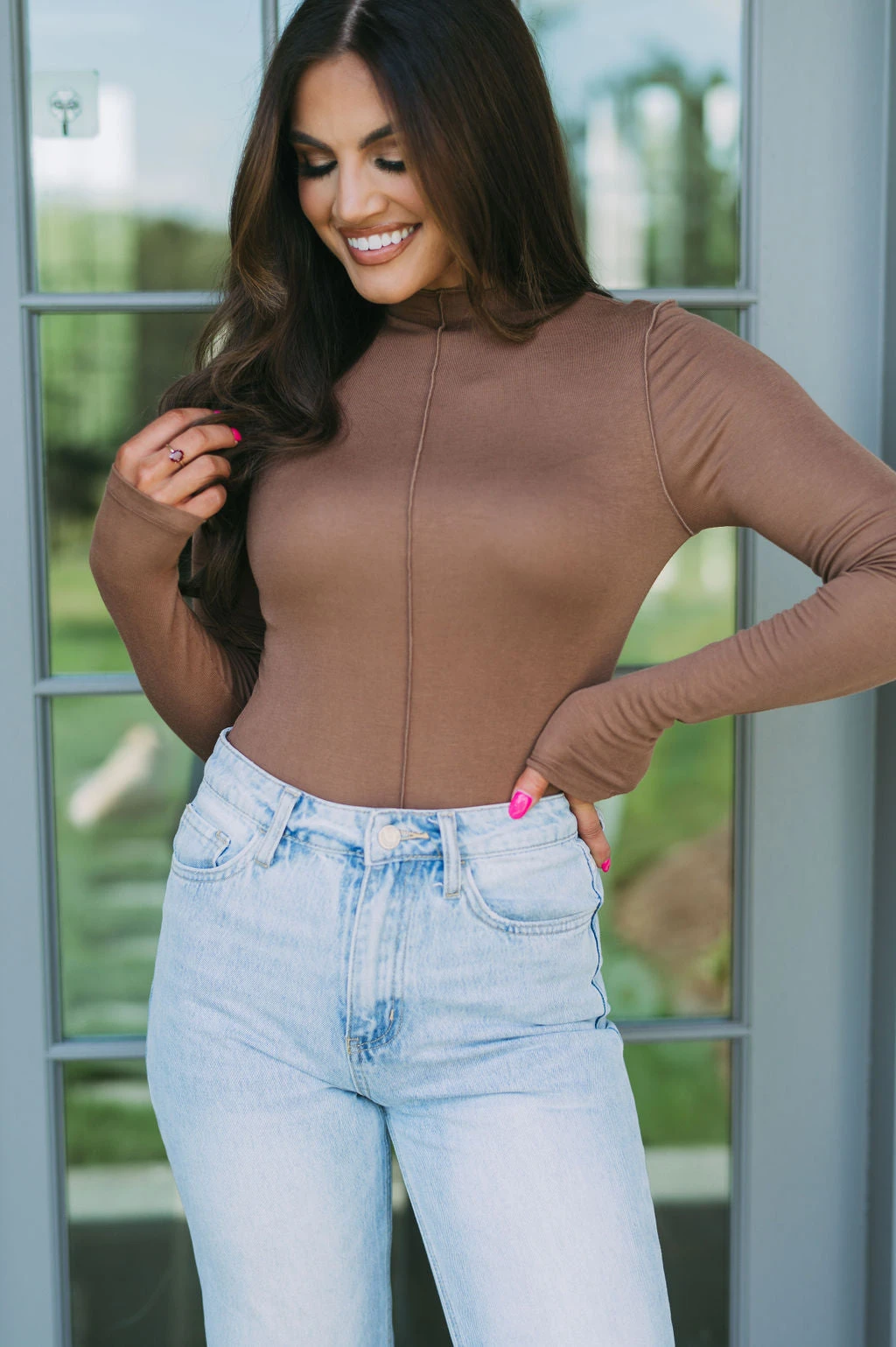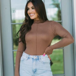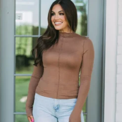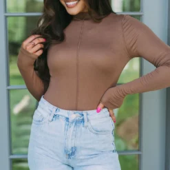 Feel the London vibes in this beautiful light brown top, designed with a full-length silhouette and exposed seams for a totally chic look. Its stretchy material fits like a glove, and the stand-up high neck adds just the right touch of sophisticated style. Embrace London chic with this effortless statement piece!