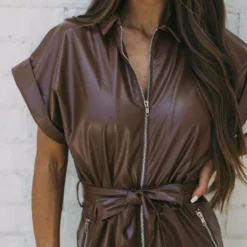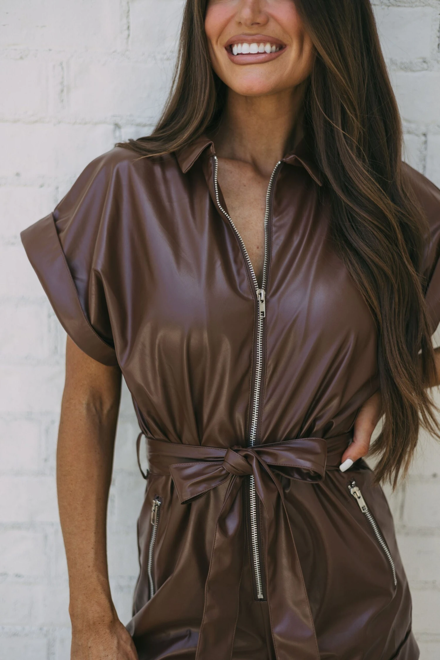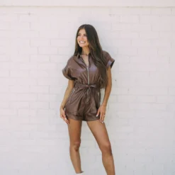 - Be a fashionista in this Maria Faux Leather Romper! This stylish piece has a collared neckline, zip up front and flattering waist tie closure for a perfect fit. Crafted from beautiful brown faux leather with a folded bottom hem, you’ll be turning heads wherever you go.Â