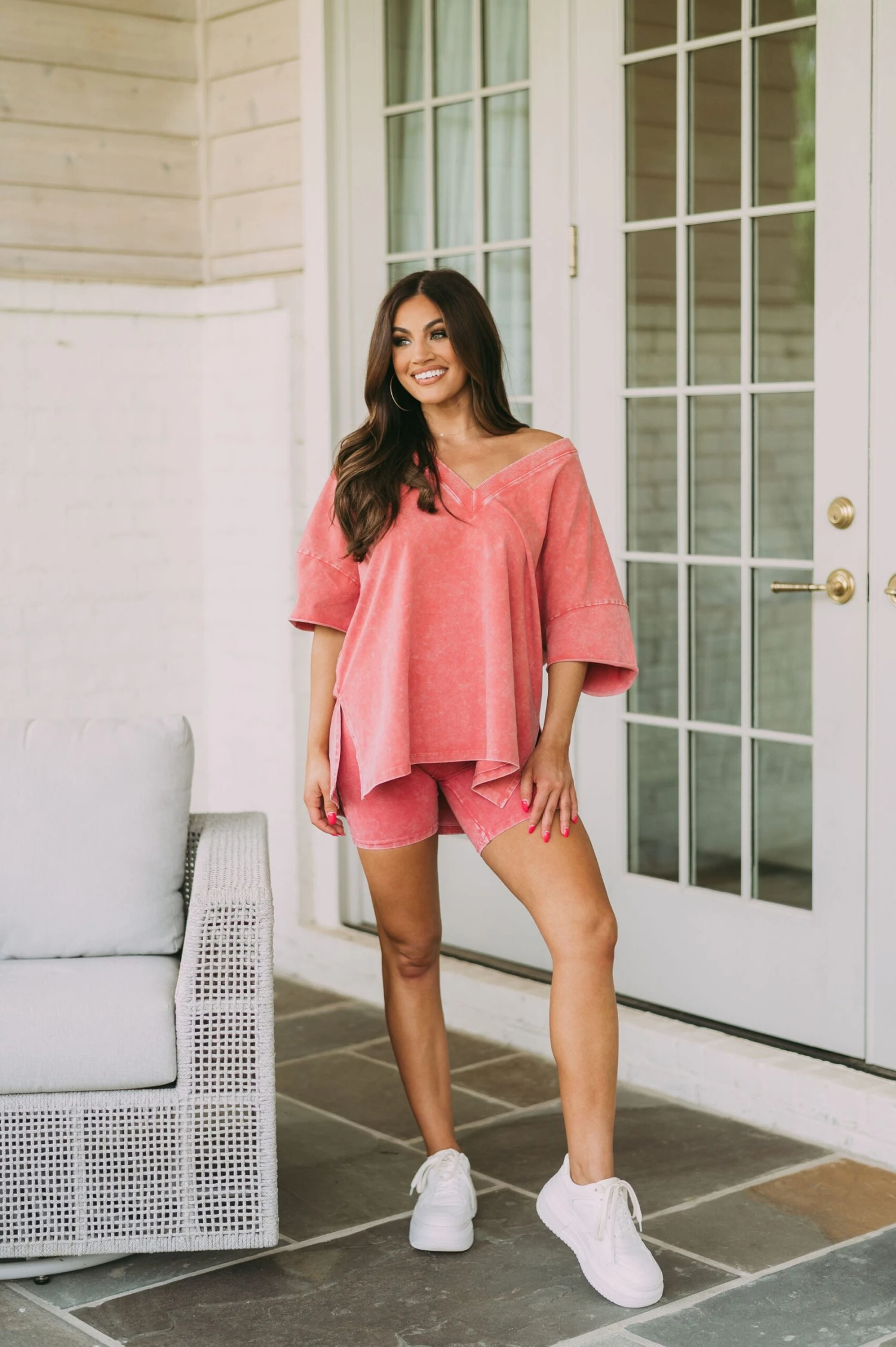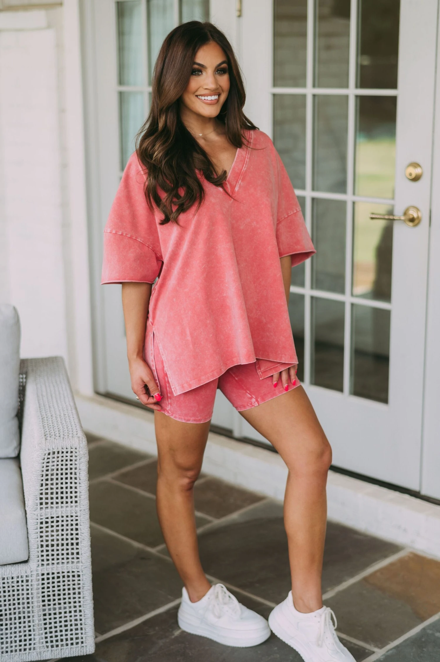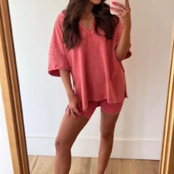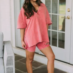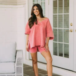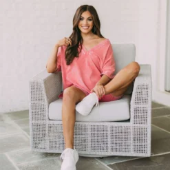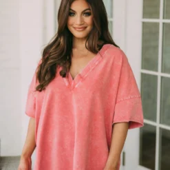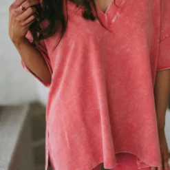 This stylish clay mineral washed top adds a unique touch to your wardrobe. Featuring a v neckline, side slits, and a relaxed fit, you’ll be sure to stay comfortable all day!