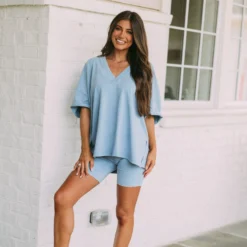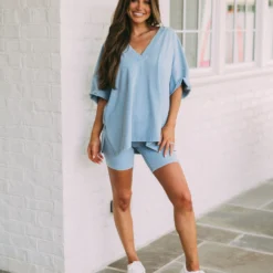 This stylish light blue mineral washed top adds a unique touch to your wardrobe. Featuring a v neckline and a relaxed fit, you’ll be sure to stay comfortable all day!