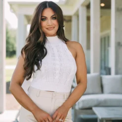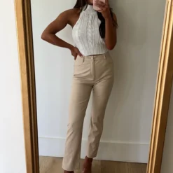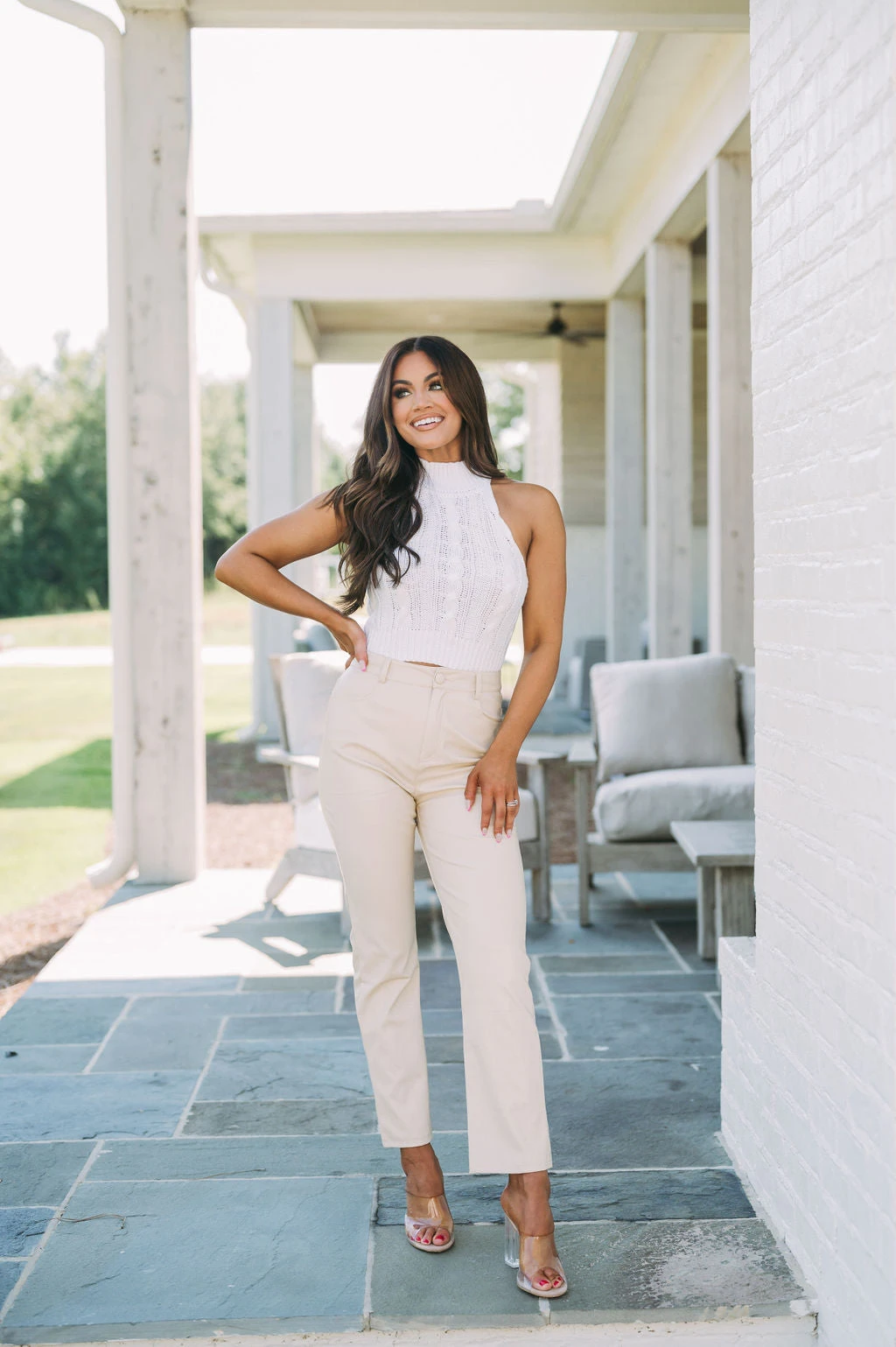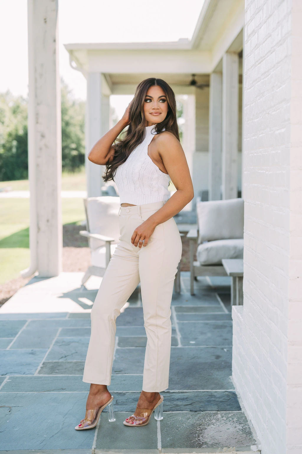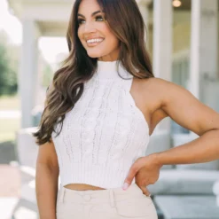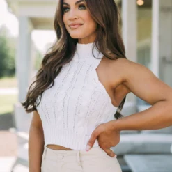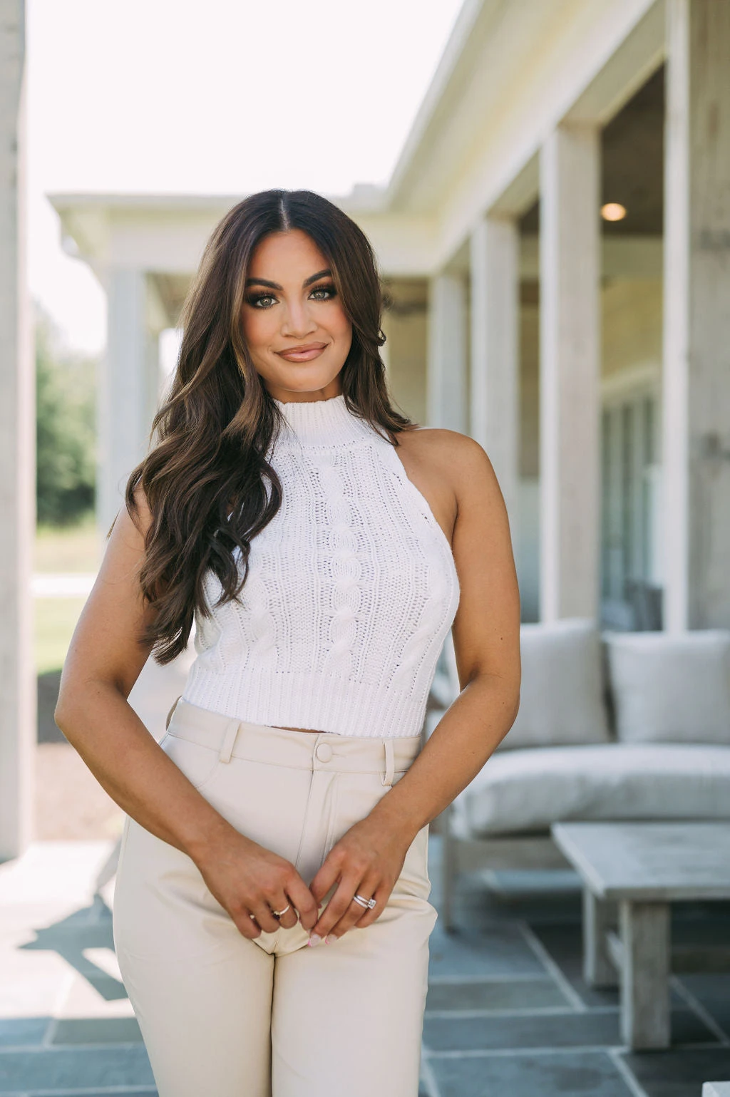 This stylish Mock Neck Cable Knit Sweater is crafted with a luxurious cable knit fabric, featuring an on-trend mock neck and a slightly cropped waist. The white color allows it to be paired with any outfit for versatile styling.