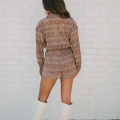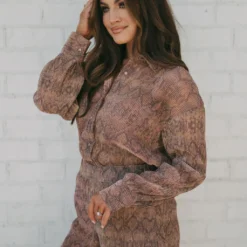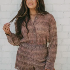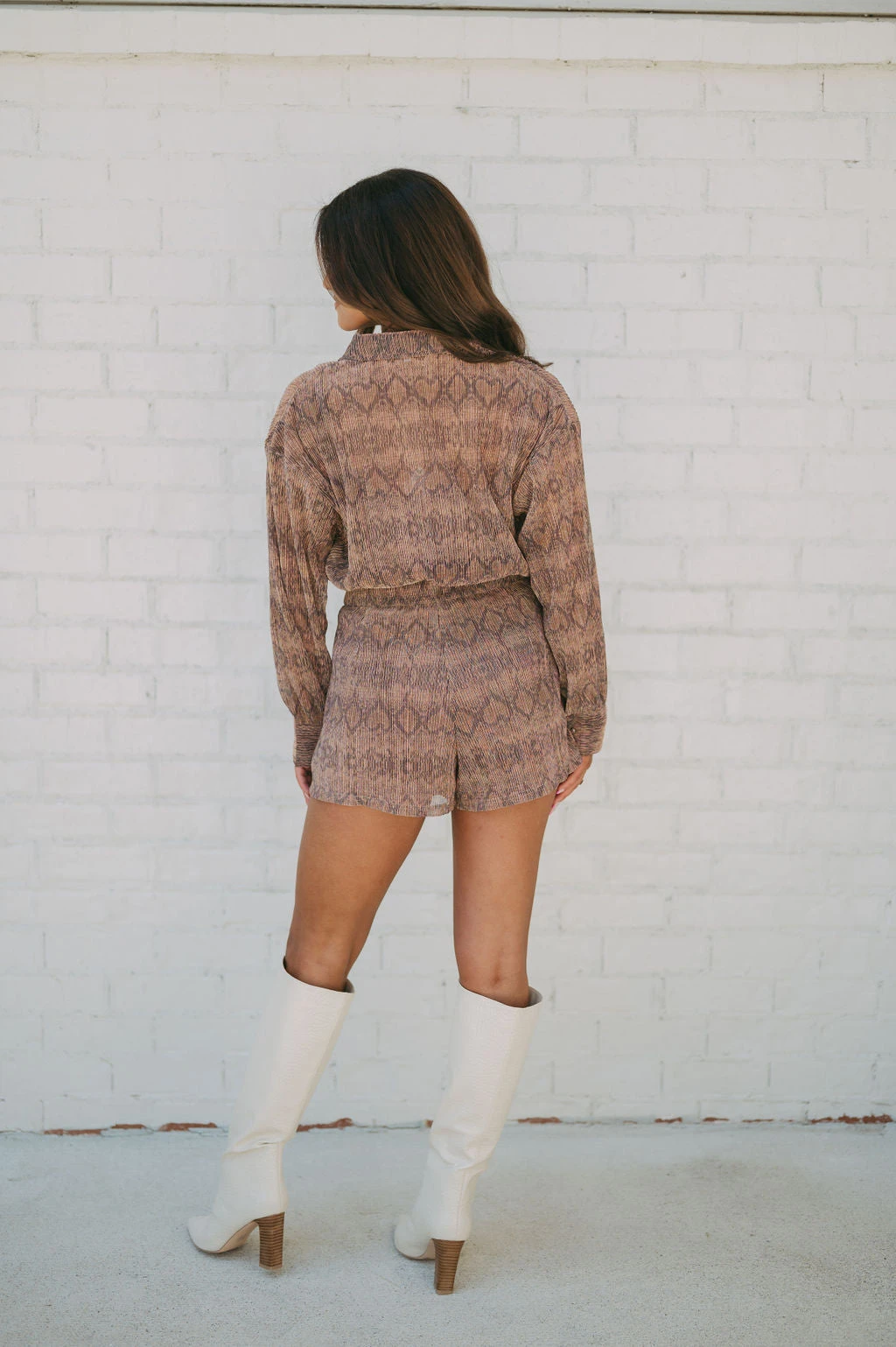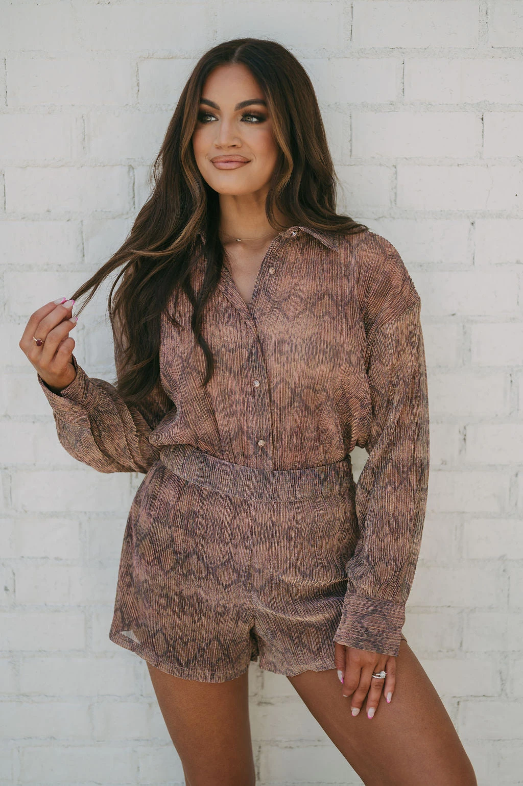 This Natalia Printed Shorts Set is a stylish, chic look featuring lined high waisted shorts with a side zipper closure, a button up blouse with a collared neckline, and a brown tank undershirt. Crafted with a subtle snake print and a metallic finish, this set looks great in any setting.