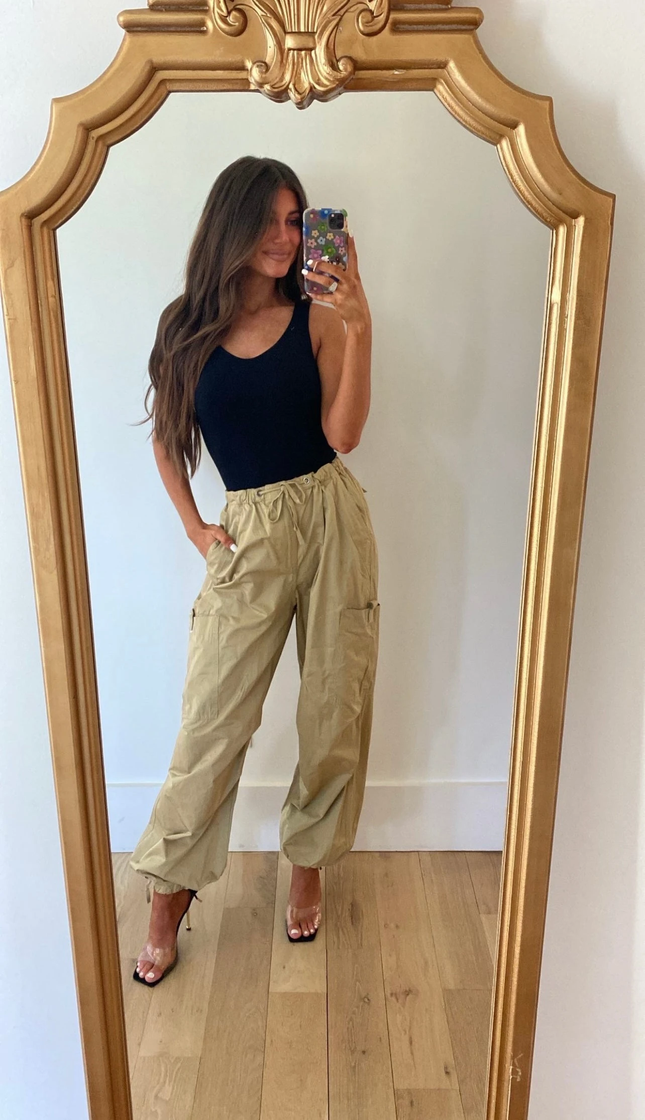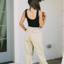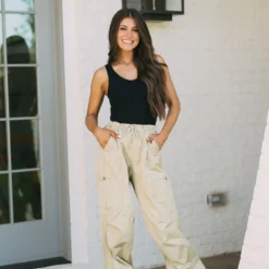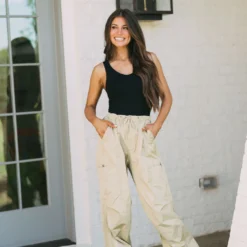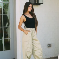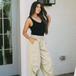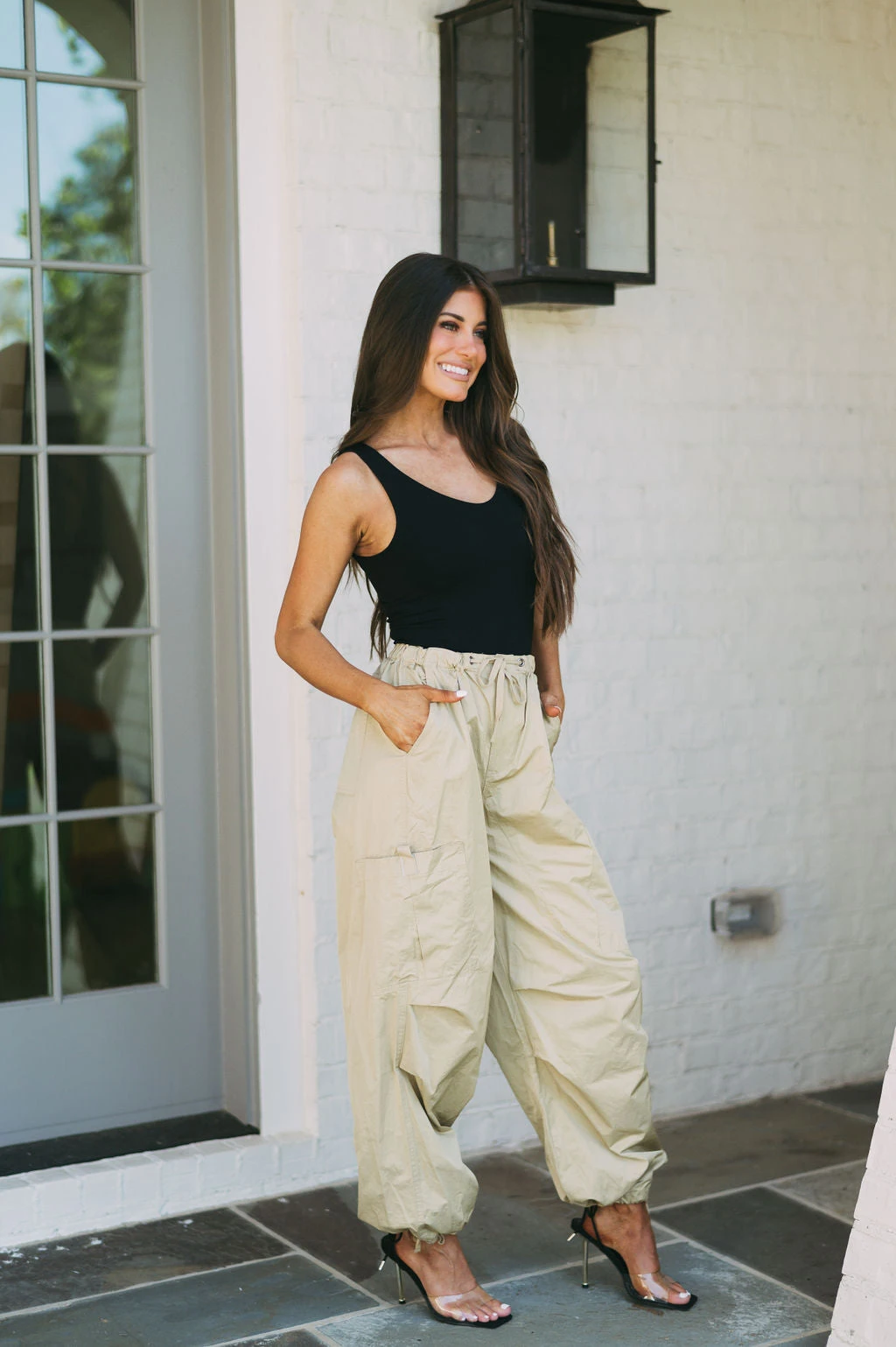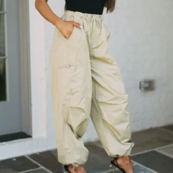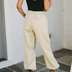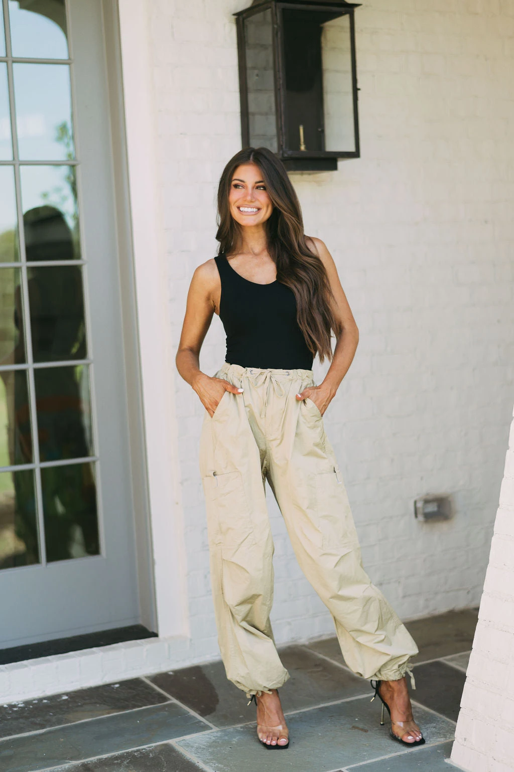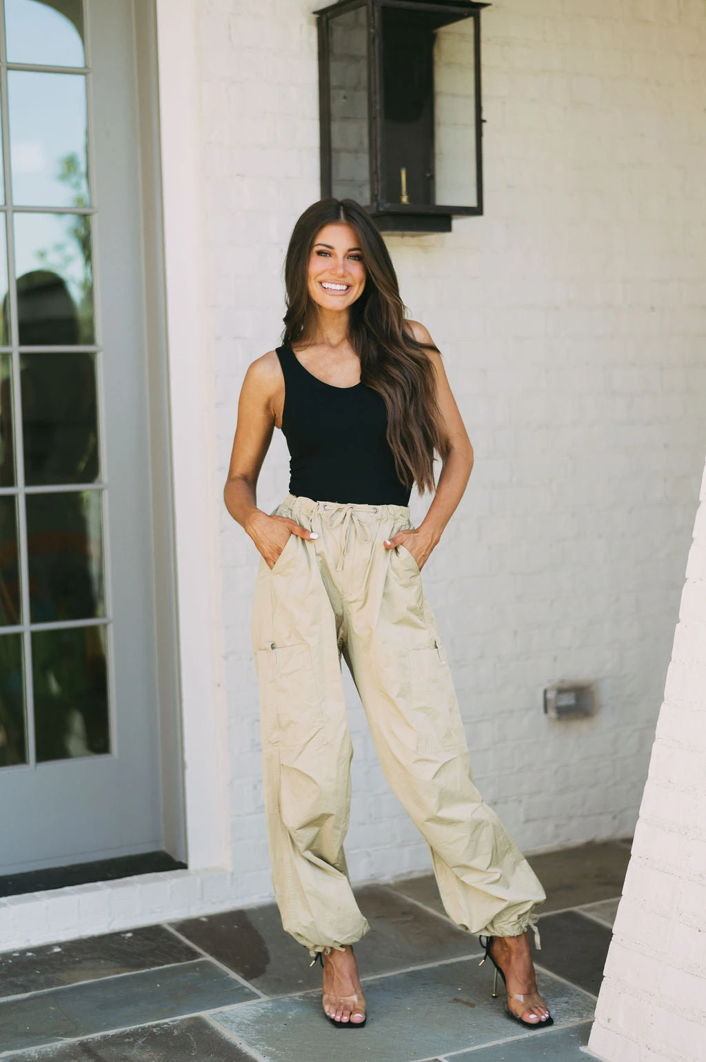 Elevate your style with On the Go Cargo Pants-Light Olive. Crafted with light olive fabric, these pants are equipped with a high drawstring waistline and adjustable bottom hem for a custom fit. Step out confidently – stay on the go!