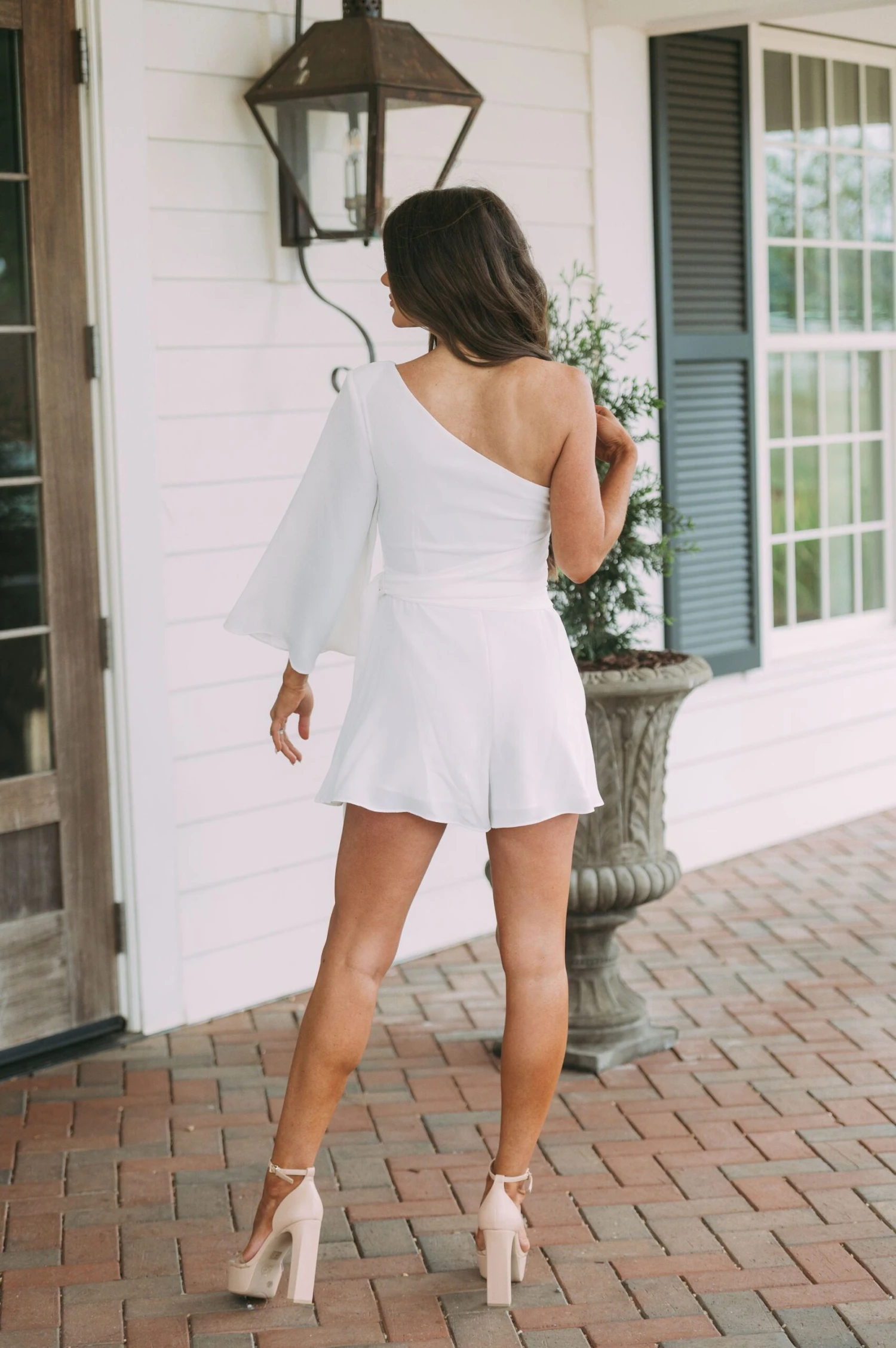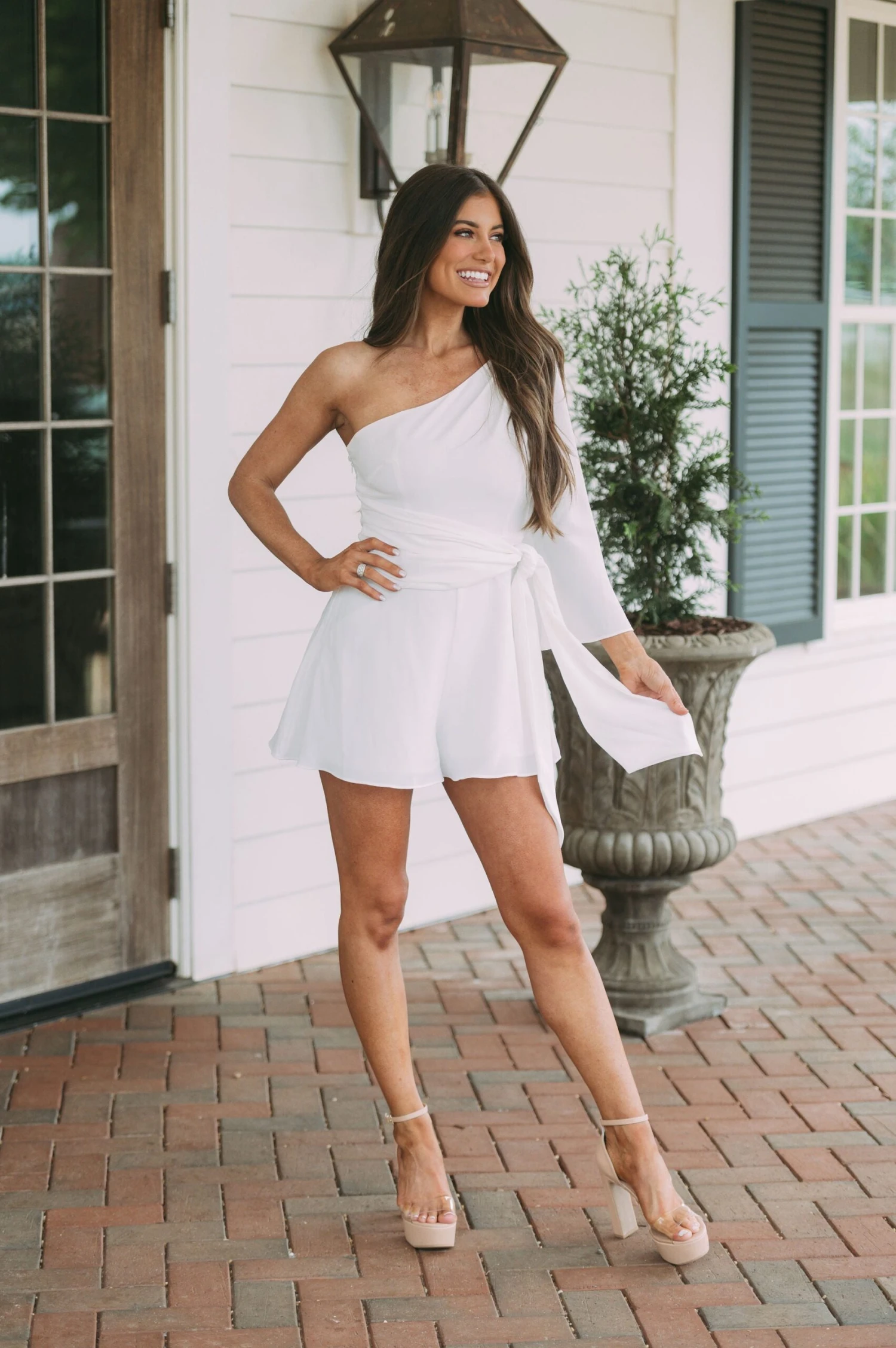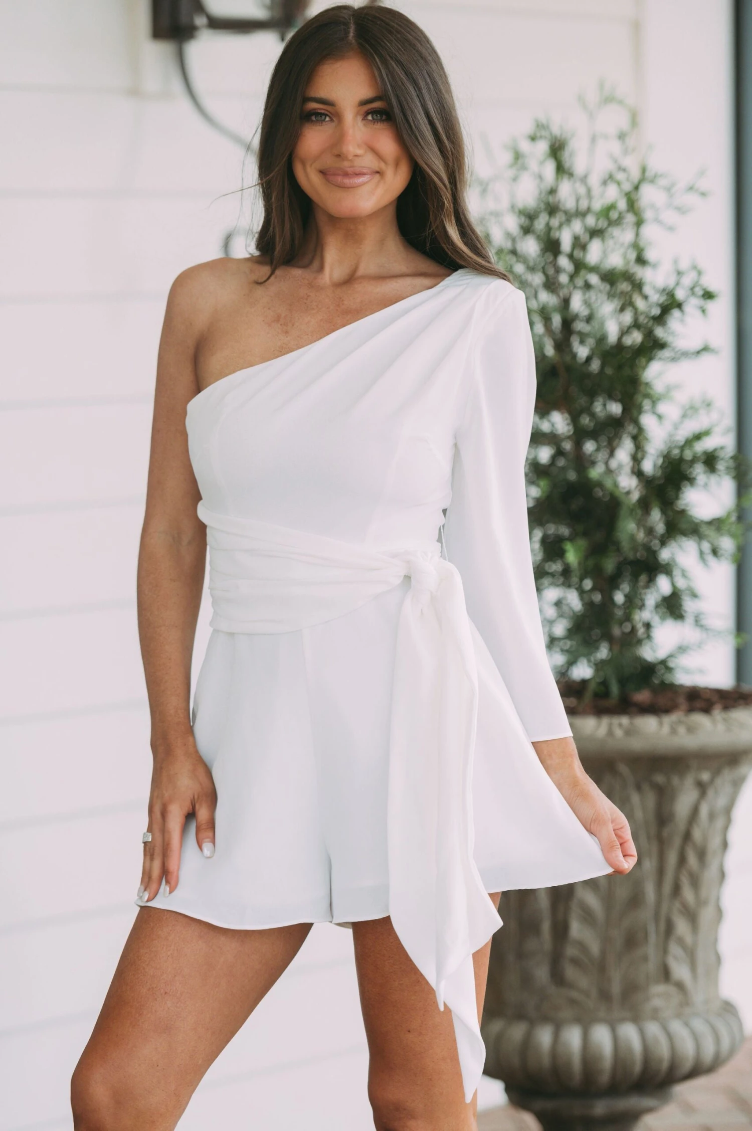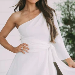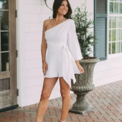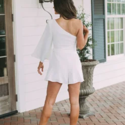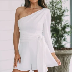 - This off white one-shoulder romper is designed with subtle sophistication. Its side-tie closure provides a tailored fit while the side zipper offers easy on/off. Fully lined for extra comfort. Perfect for any occasion.