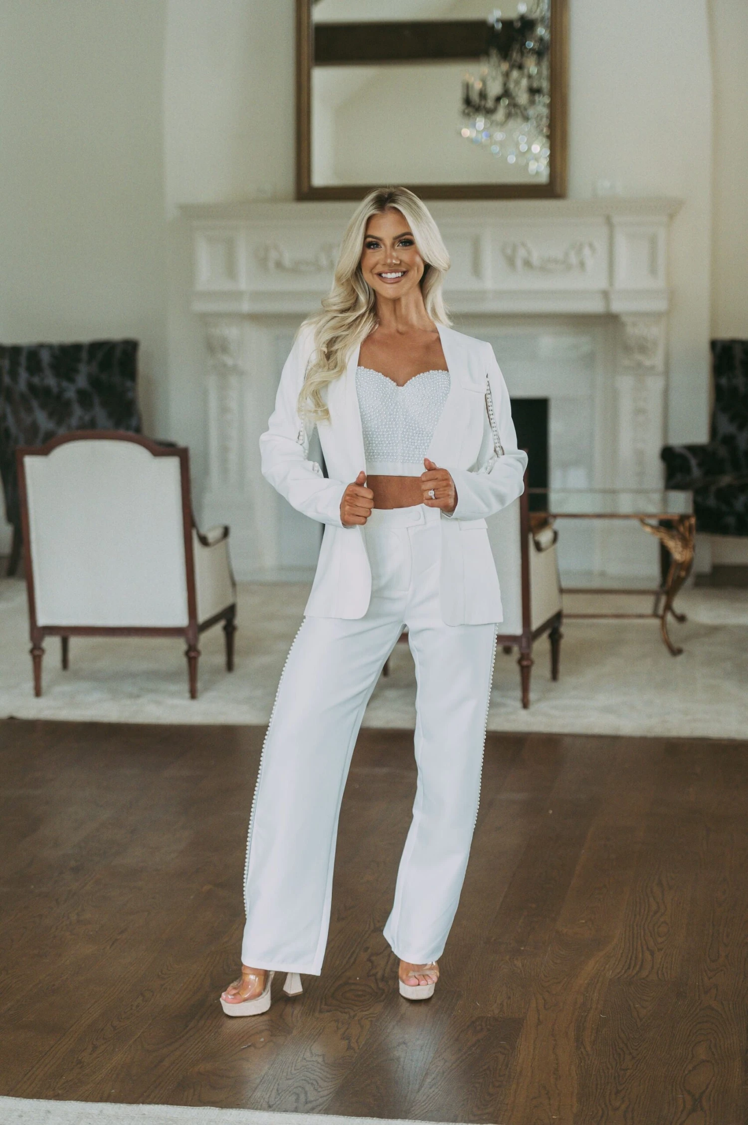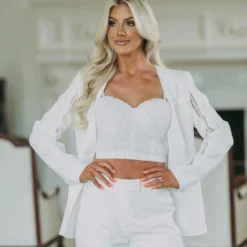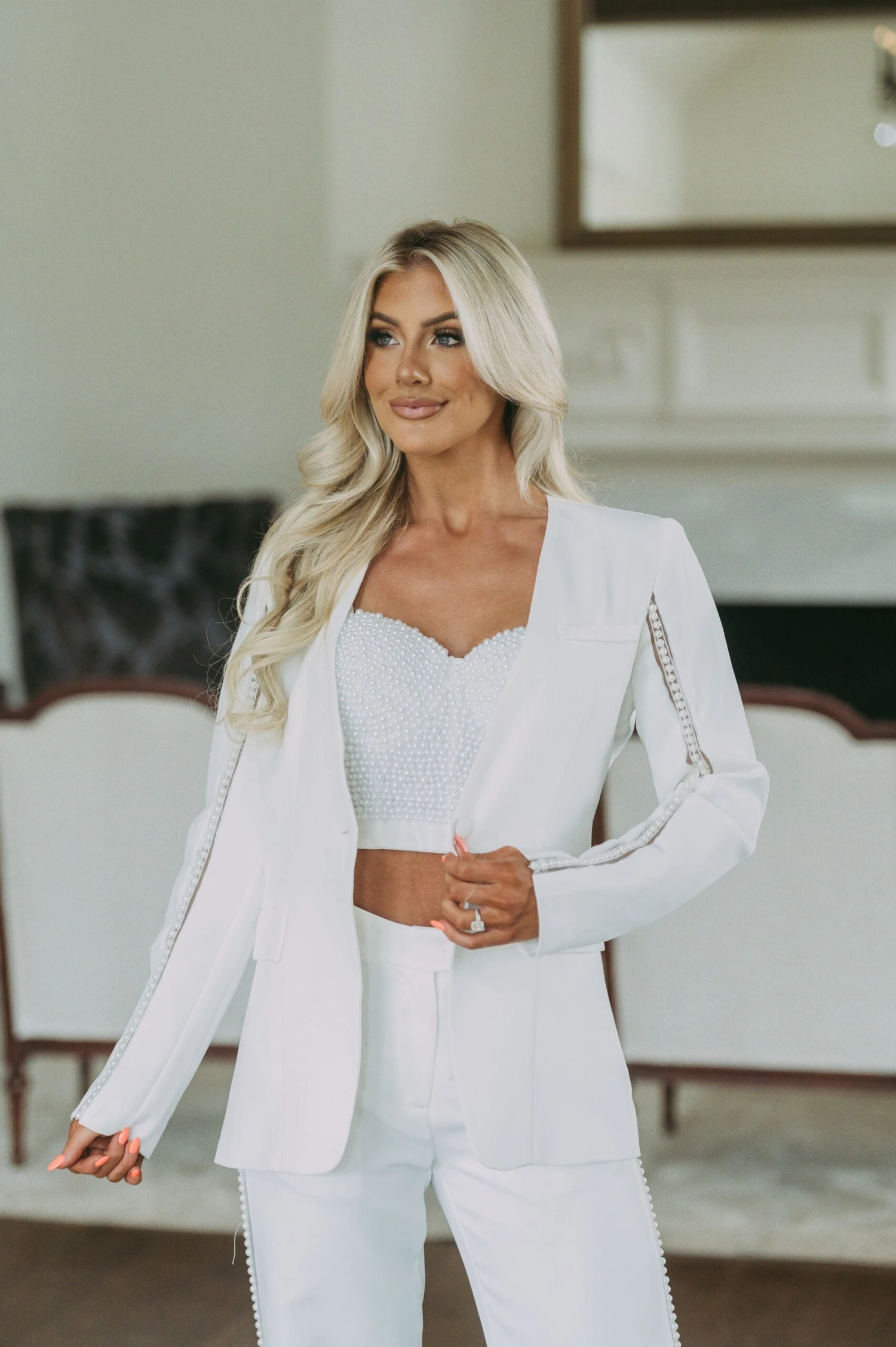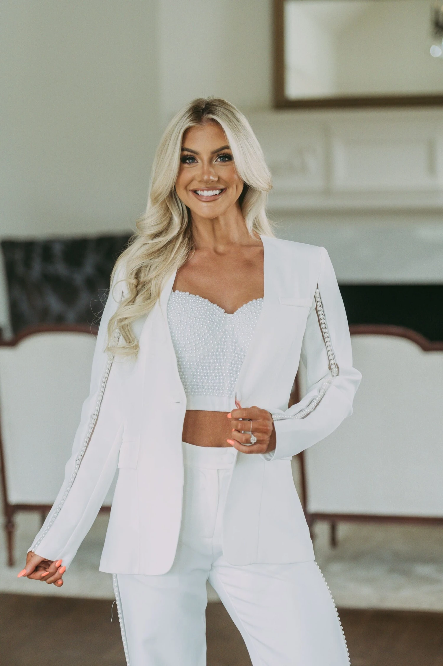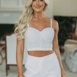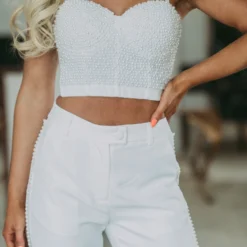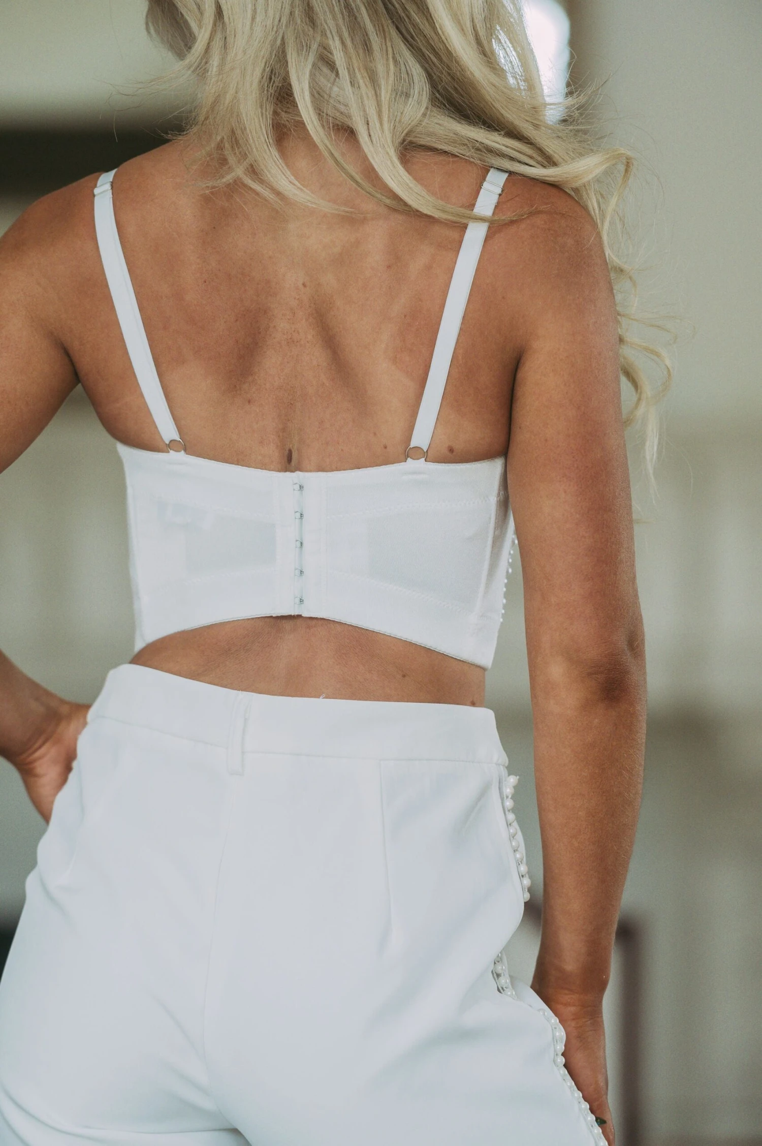 This white bustier crop top lends a classic look with modern flair. Featuring adjustable spaghetti straps and a clasp closure back, the pearl accents add the perfect touch of elegance. Ideal for a night out or special occasion!